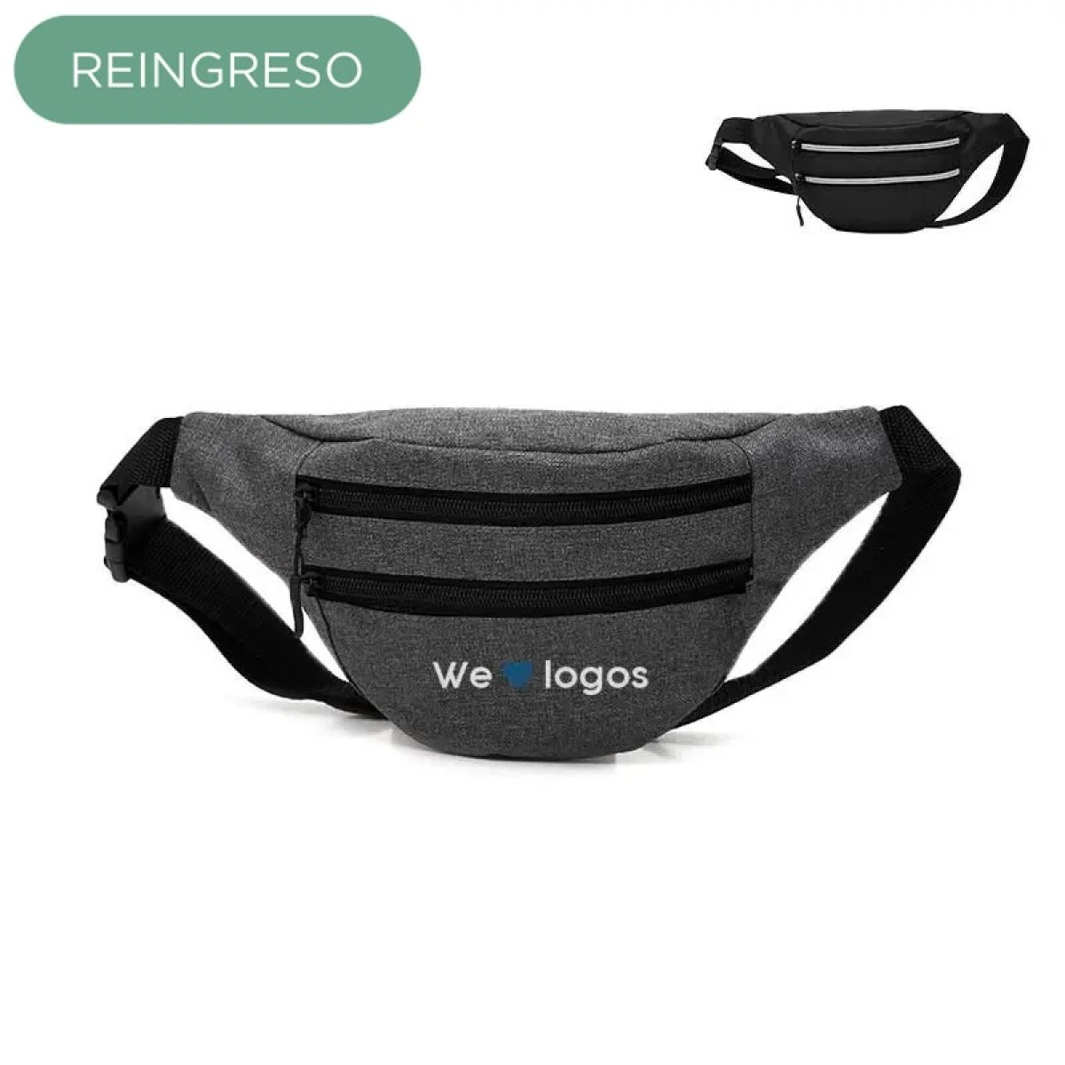 Banano de 600D polyester, duradero y resistente, con dos bolsillos con cierre para mayor seguridad. Cuenta con una correa negra ajustable con broche para un ajuste cómodo.