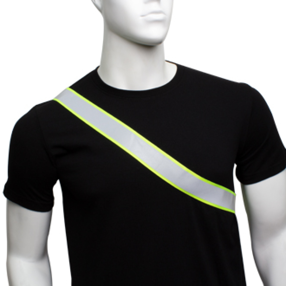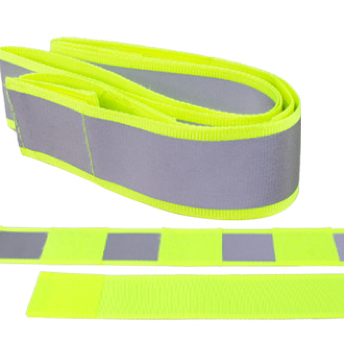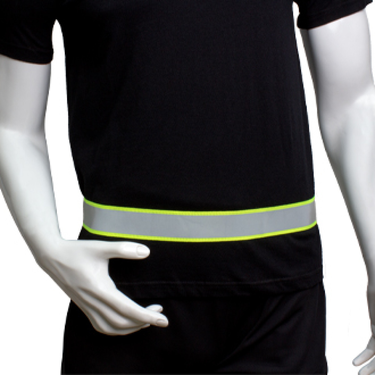 Banda (cinta) elástica reflectante para hombro y cintura, con 5 ajustes de velcro. Se puede usar como banda presidencial o como cinturón. Viene en práctica bolsa de polipropileno con orificio para colgar en ganchera.