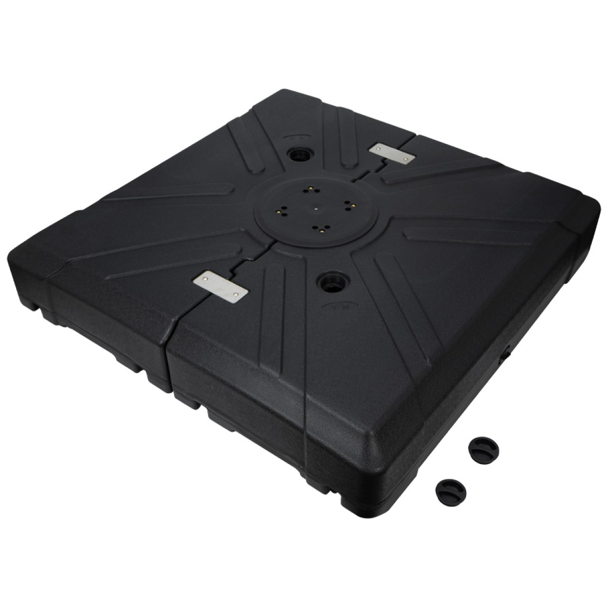 Base cuadrada de plástico HDPE rígido, rellenable (con arena o piedrecillas, para darle mayor peso), con una capacidad total de 180kg. Incluye 2 ruedas, para fácil traslado y movimiento del quitasol.
