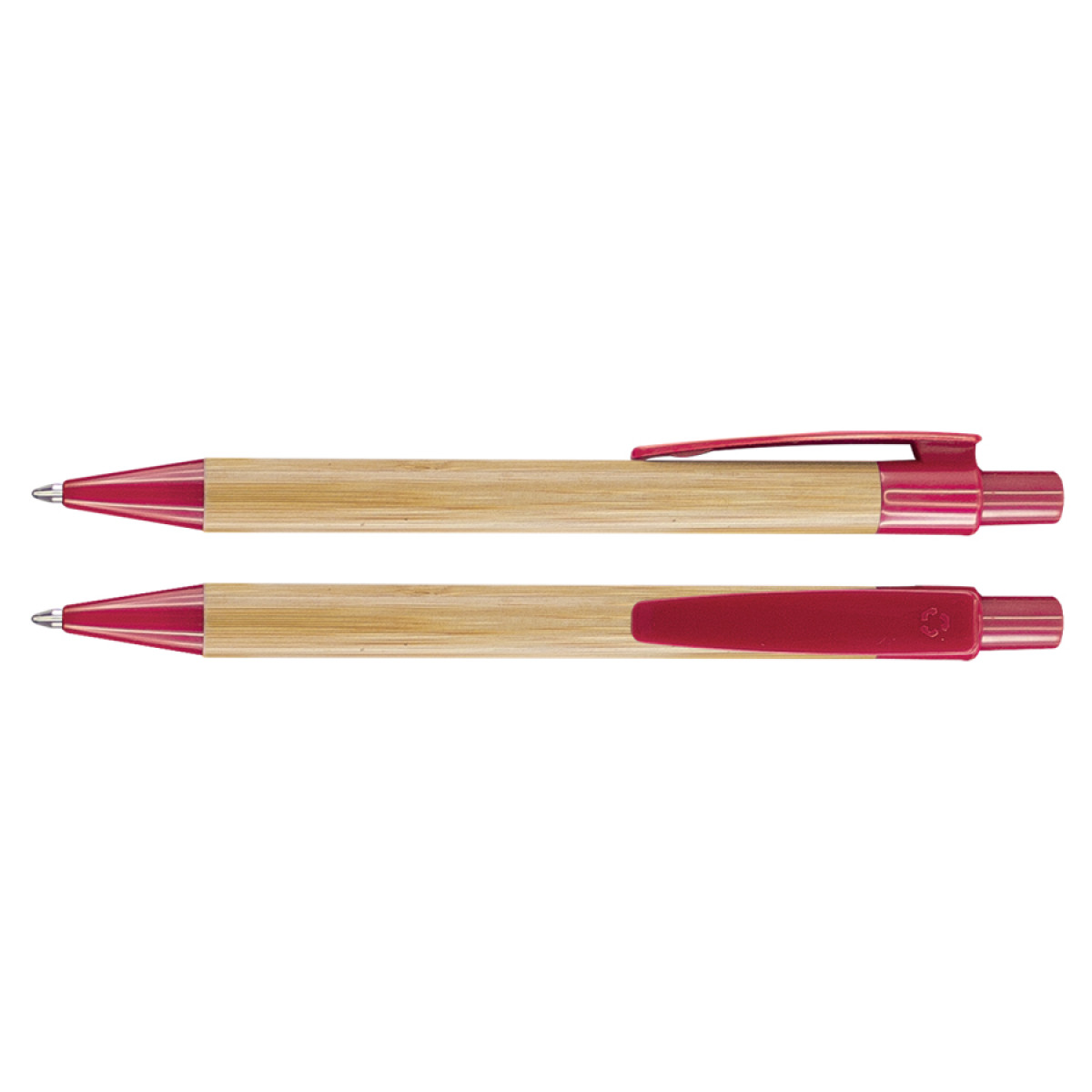 Bolígrafo modelo "Sustenta". Cuerpo de madera de Bamboo, terminales de plástico PET reciclado. Escritura azul.