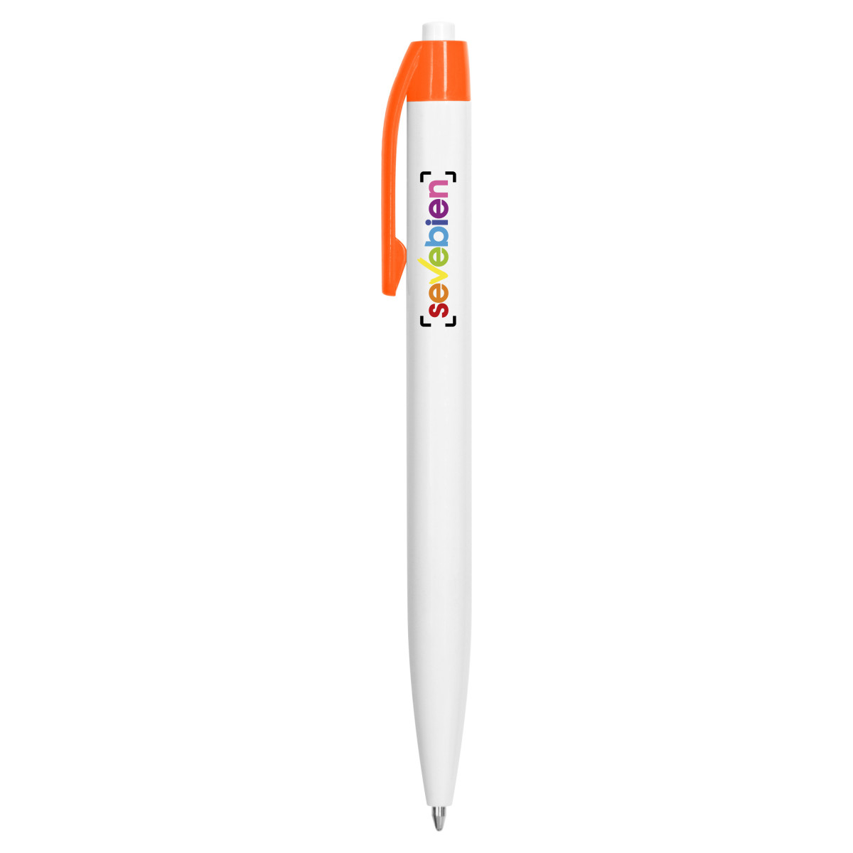 Plástico. Bolígrafo con cuerpo y pulsador de color blanco y clip en color. Tinta negra.