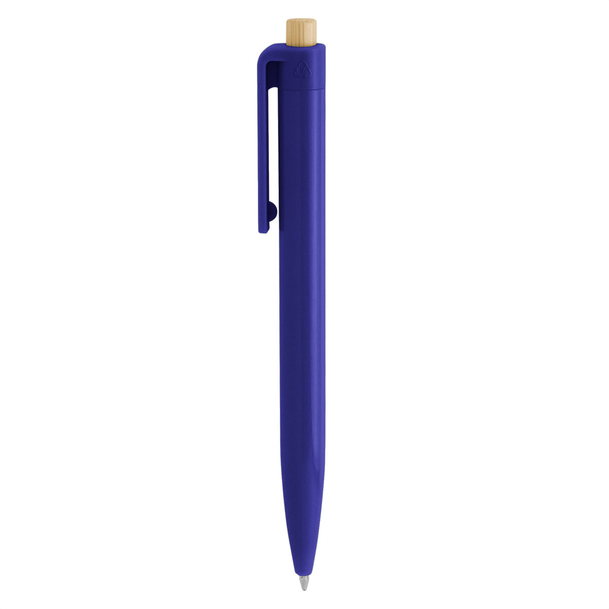 Diseño moderno con materiales reciclados.Bolígrafo retráctil. Cuerpo plástico en diferentes colores acabado brillante. Pulsador de bambú. Medidas: 1,05 x 13,5 cm.