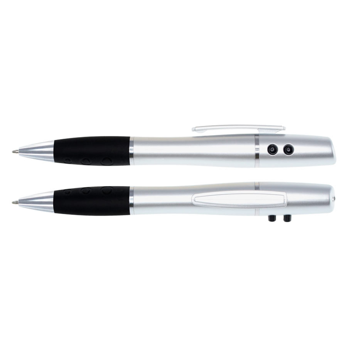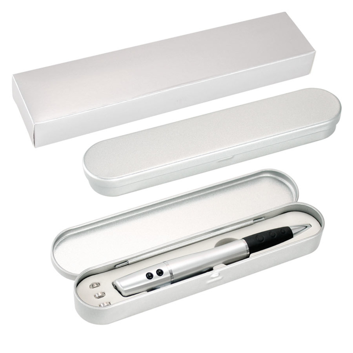 Bolígrafo plástico multi-función 3 en 1. Incluye bolígrafo, linterna LED y puntero láser. Escritura negra. Presentación en estuche metálico y caja plateada de cartón.