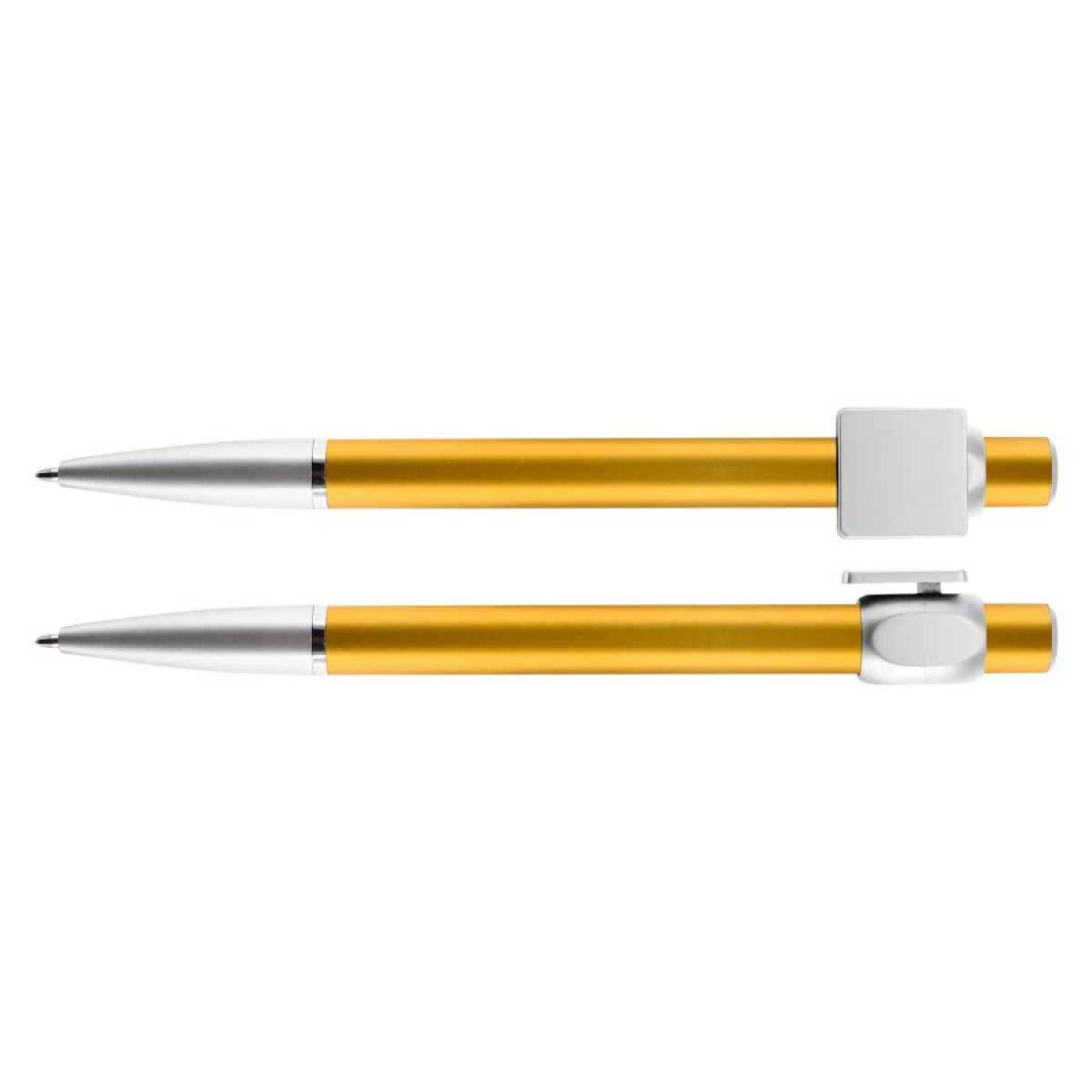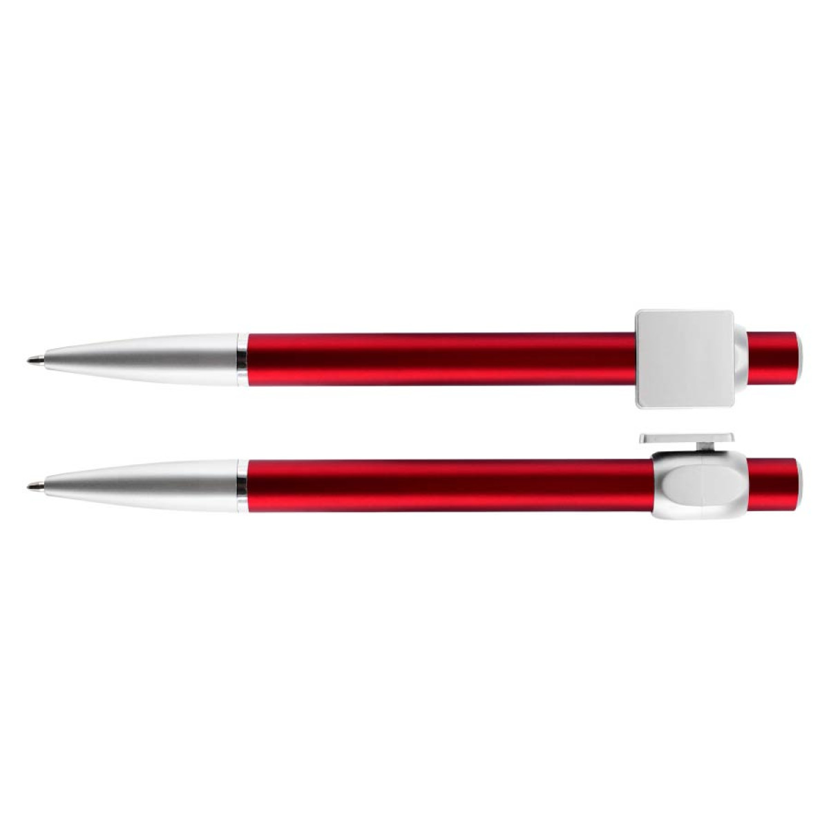 Bolígrafo "Badge" con cuerpo de color metalizado y clip cuadrado plateado, ideal para imprimir isotipos. Escritura azul.