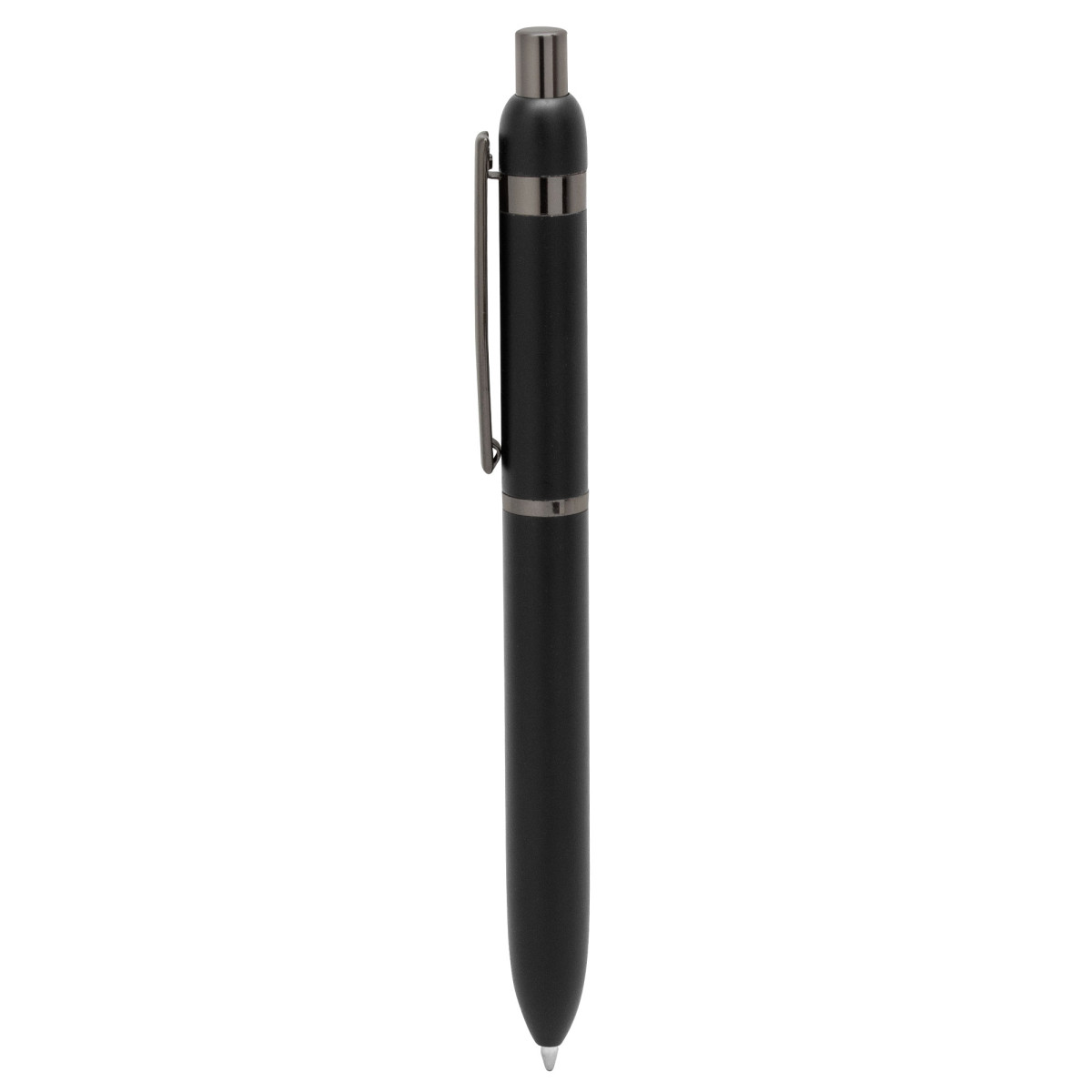 Metal. Cuerpo de aluminio. Bolígrafo retráctil. Clip, botón y anillos metálicos color plata. Tinta Negra. Destape electroplateado en ambas partes. Presentación en estuche con cierre magnético.