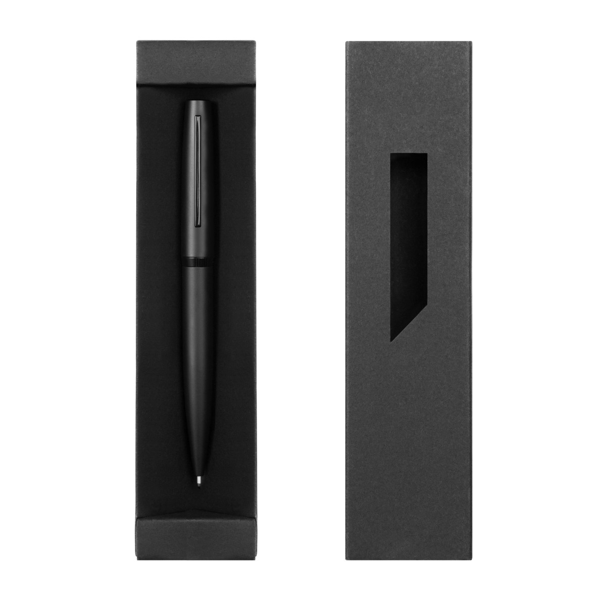 Metálico. Cuerpo color mate. Clip y anillo metálico. En la parte superior destape electroplateado. Apertura giratoria. Tinta negra. Presentación en caja de regalo.