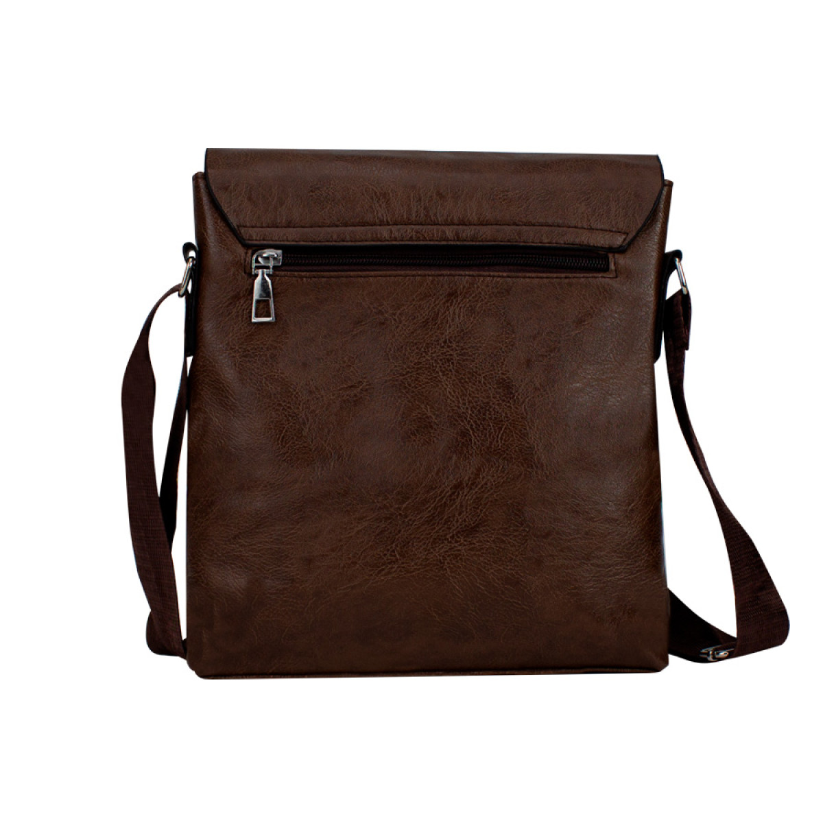 Bolso-cartera de eco-cuero café oscuro, modelo "DEXTER". Cuenta con colgador de PVC café, 1 compartimento central y 1 compartimento delantero. Capacidad 3L, tamaño 22.5 x 27.5 x 5 cm. Presentación en bolsa de tela TNT color café + bolsa OPP translúcida.