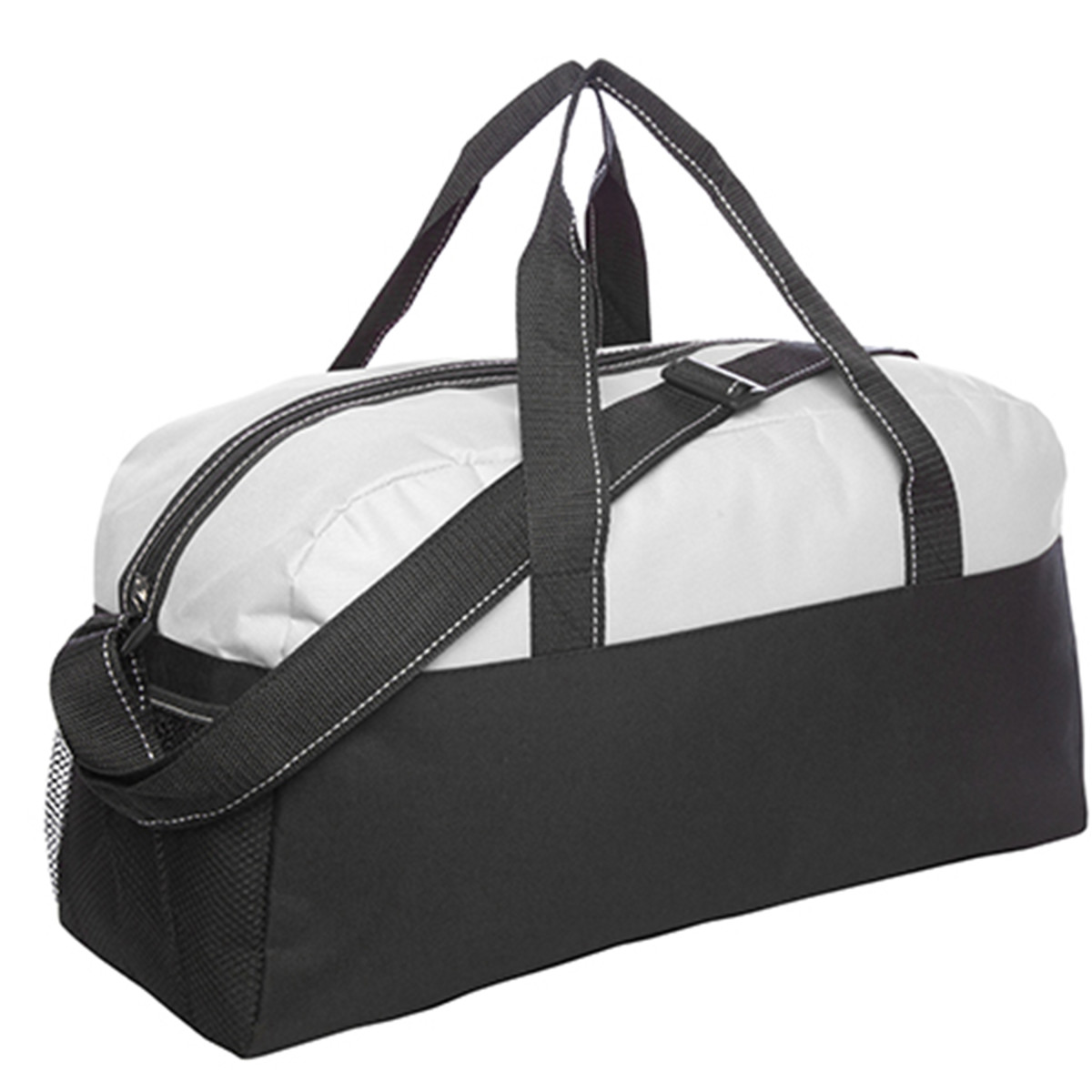 51 x 18,5 x 25 cm. Capacidad 23 litros aprox. Poliéster 300D. Bolso con bolsillos de redes en los laterales. Dos manijas, correa ajustable y cierre principal con vivos en color blanco.