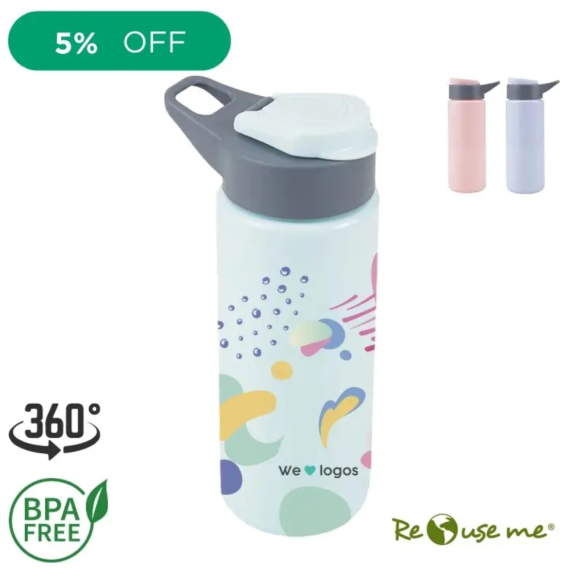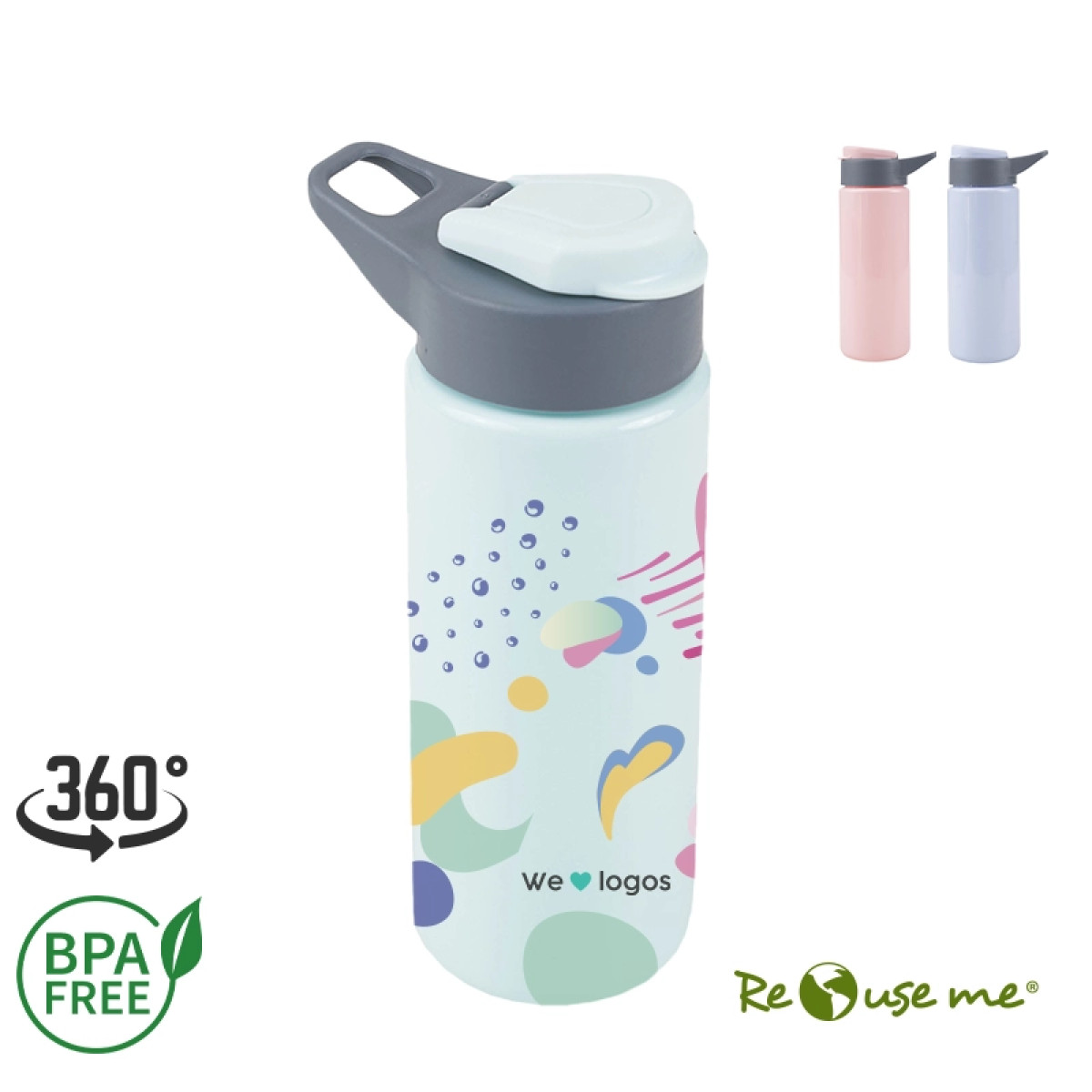 Botella reutilizable de PET con tapa de Polipropileno, cuenta con un agarre en la tapa para su transporte. Producto libre de BPA. No es apta para bebidas calientes, lavavajillas ni microondas. Capacidad: 600ml. ReUseMe