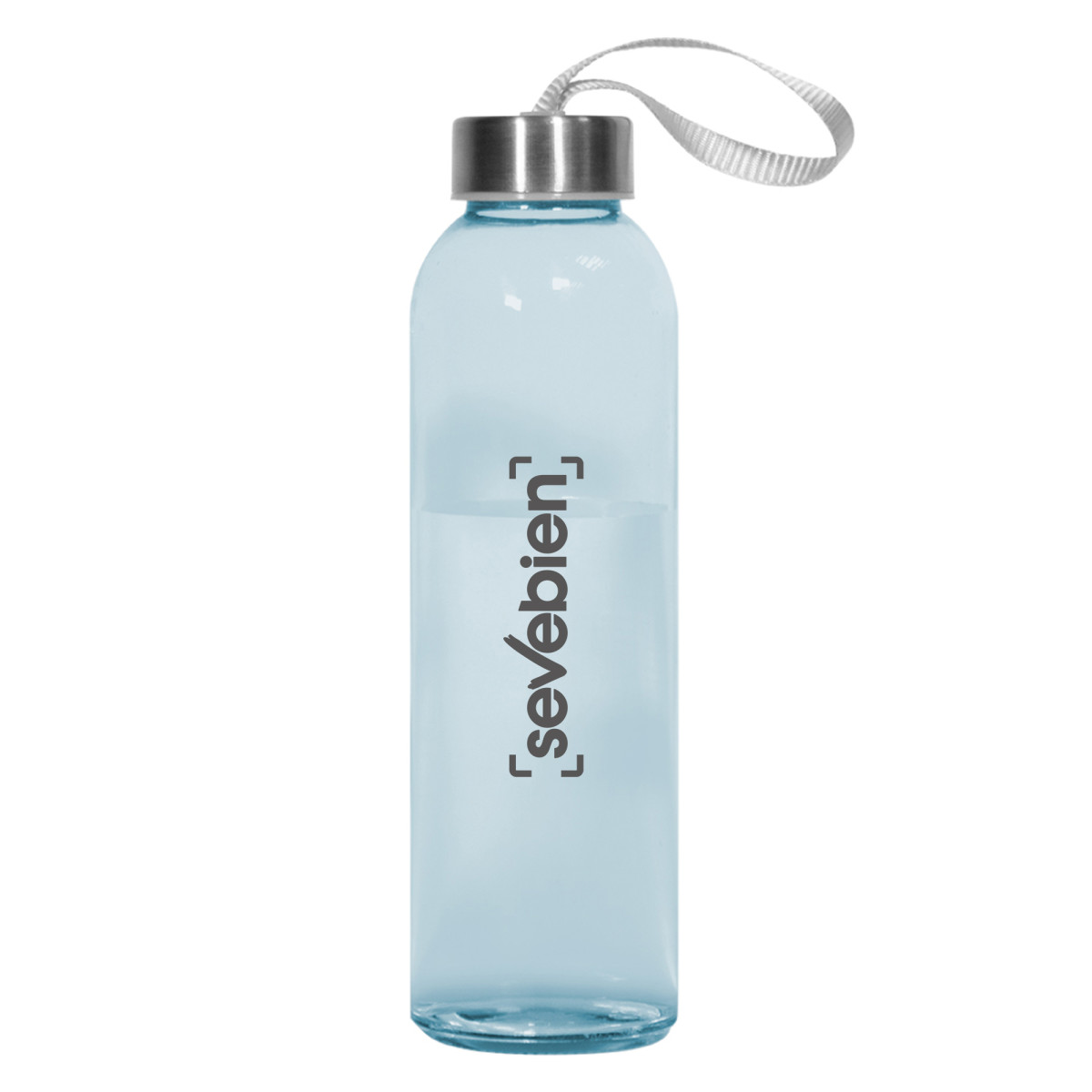 Ø 6,2 x 23 cm. Capacidad 500 ml. Vidrio resistente. Cuerpo traslúcido con tapa de acero inoxidable y tira color gris que permite transportarla. Presentación en caja de regalo.