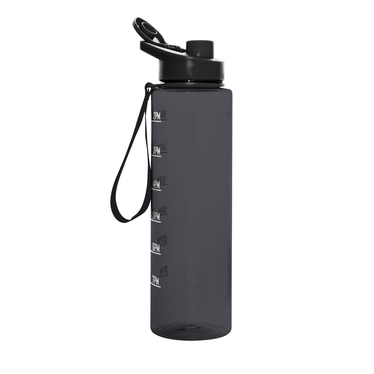 Tu meta en cada sorbo.Botella con marcador de tiempo y medida. Color translúcido con tapa plástica flip top con asa, boquilla y correa del mismo color de la botella.Medidas: Ø 7,5 x 27,5 cm. (con tapa)