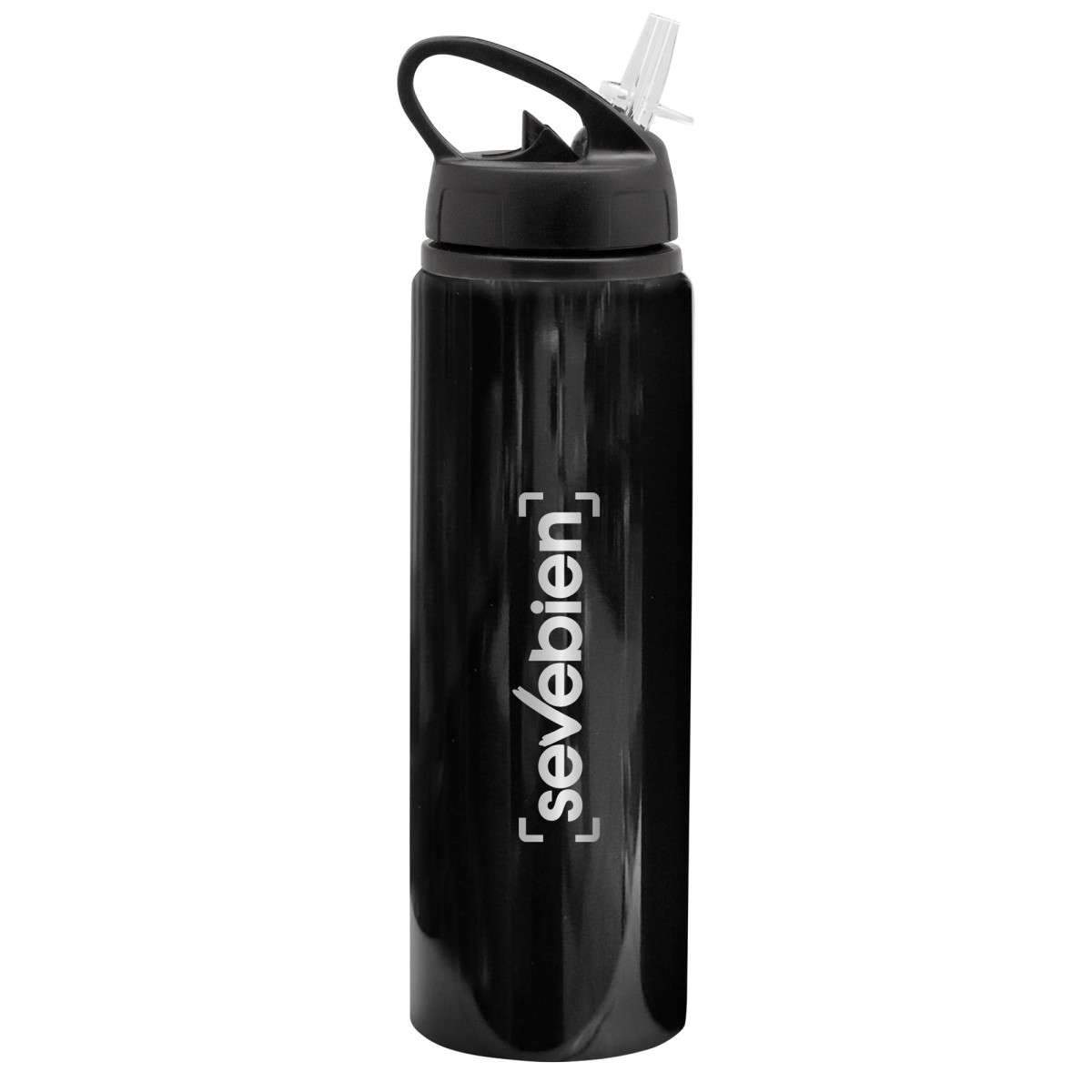 Clásica e Ideal para cualquier ocasión.Botella de aluminio con manija de agarre en la tapa, sorbete plástico y boquilla rebatible. Tapa a rosca de plástico. Medidas: Ø 7 x 25 cm.