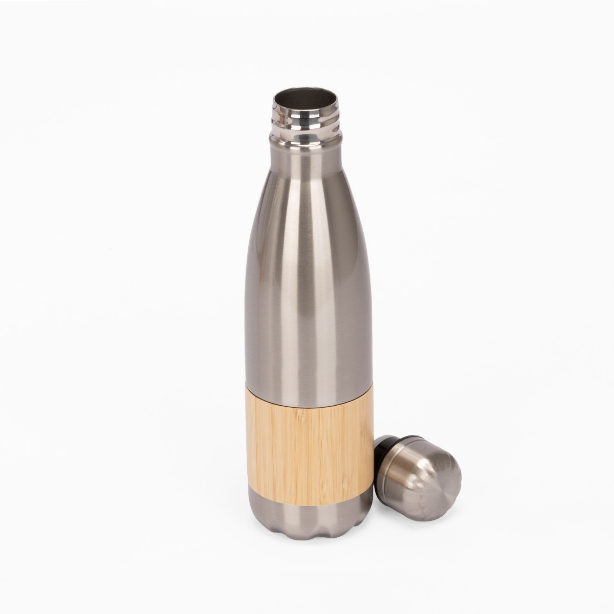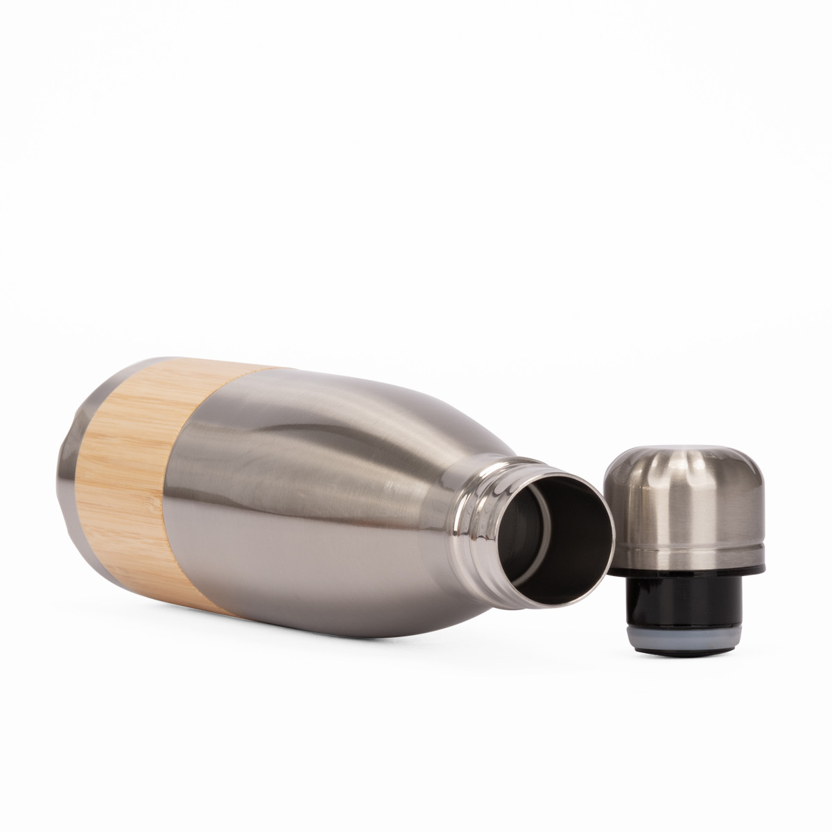ESTOCOLMO es una botella de acero inoxidable reciclado con un diseño limpio y atemporal. Con capacidad de 500 ml y doble pared para conservar la temperatura de tus bebidas, combina practicidad y elegancia en cada detalle. Su cuerpo blanco brillante y el elegante recubrimiento de bambú aportan una estética natural que conecta con hábitos responsables. La tapa de rosca metálica asegura un cierre hermético y duradero. ESTOCOLMO es ideal para marcas que desean proyectar sobriedad, sostenibilidad y estilo con cada sorbo.