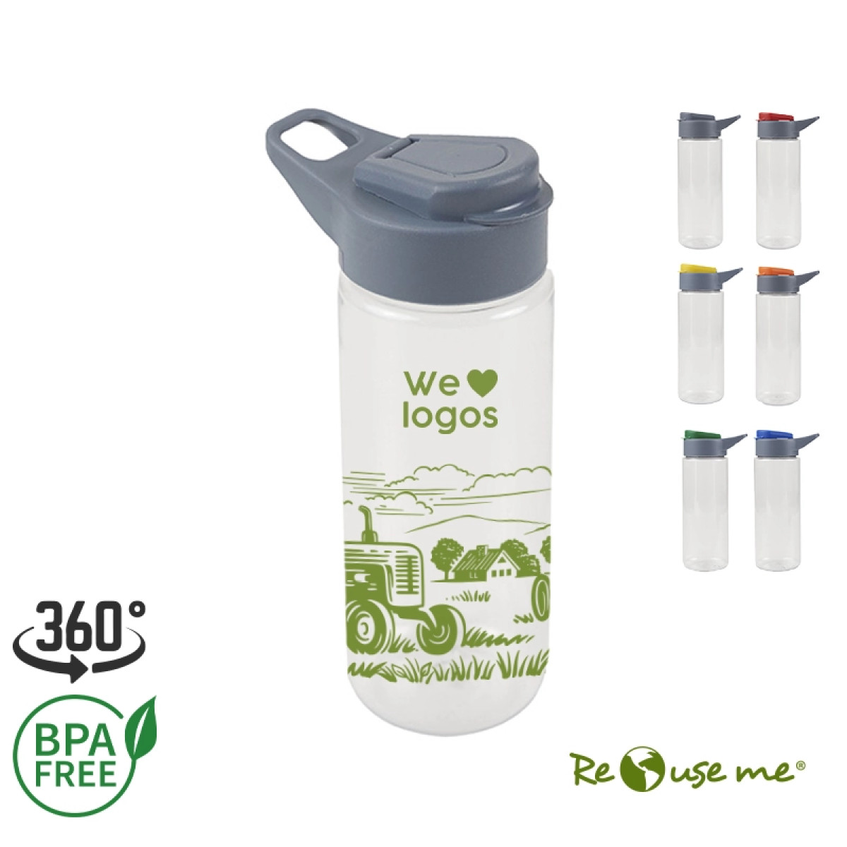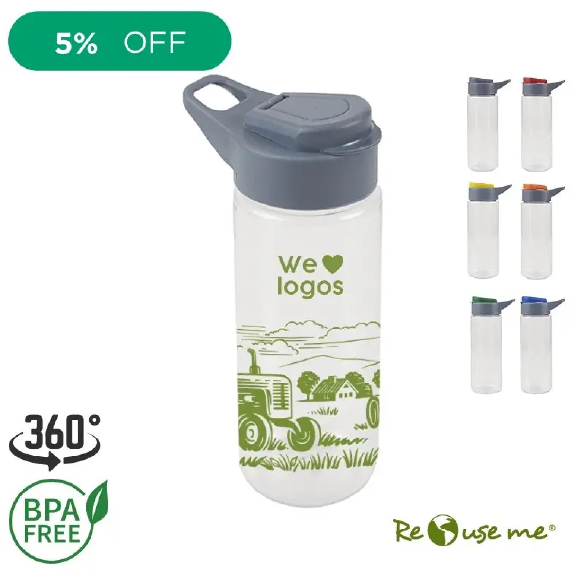 Botella transparente reutilizable de PET con tapa de Polipropileno, cuenta con un agarre en la tapa para su transporte. Producto libre de BPA. No es apta para bebidas calientes, lavavajillas ni microondas. Capacidad: 600ml. ReUseMe