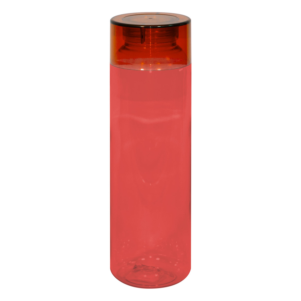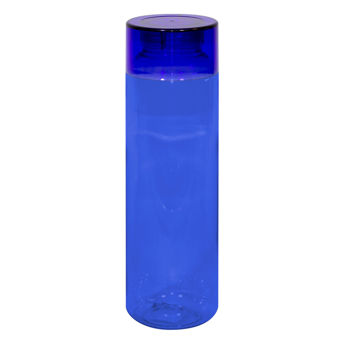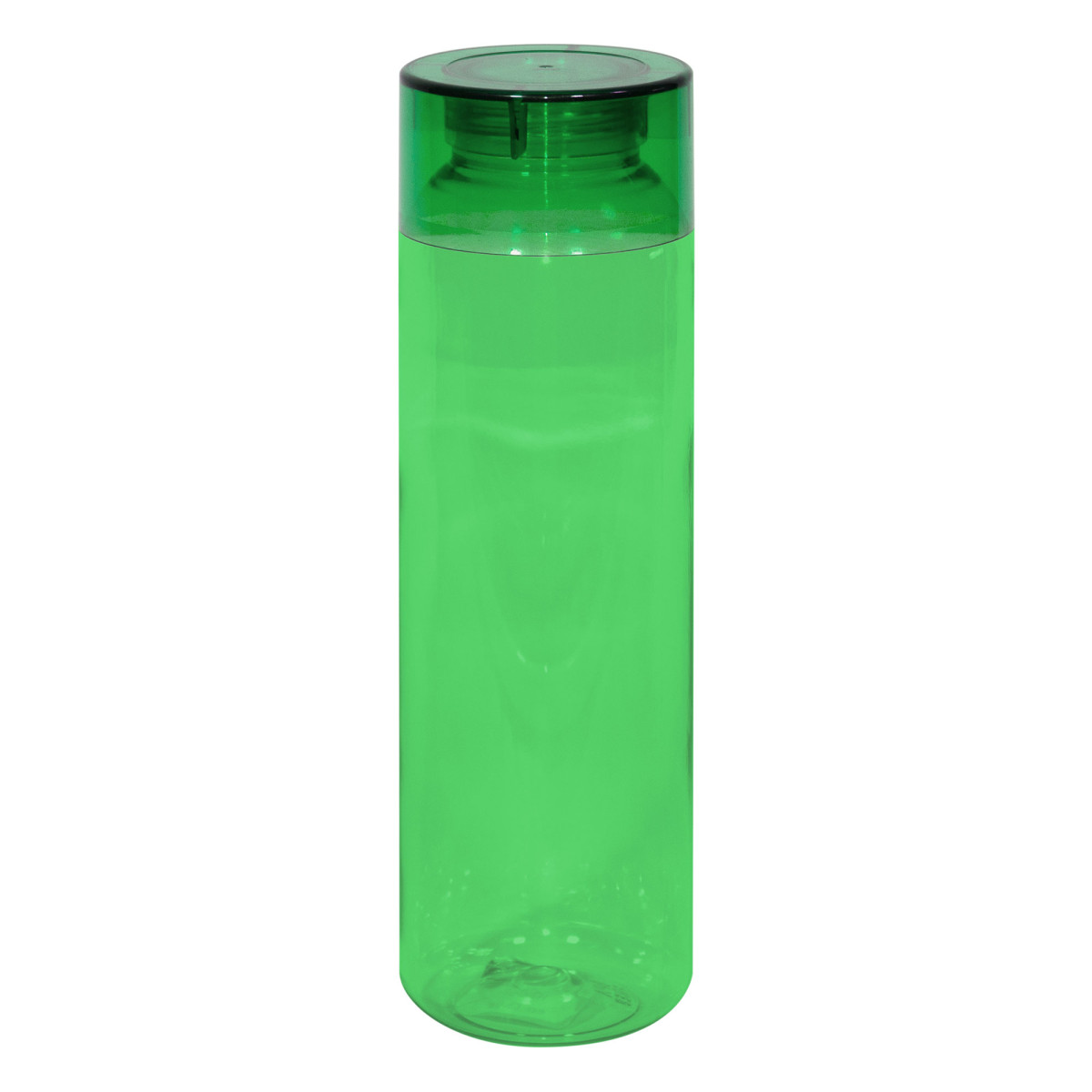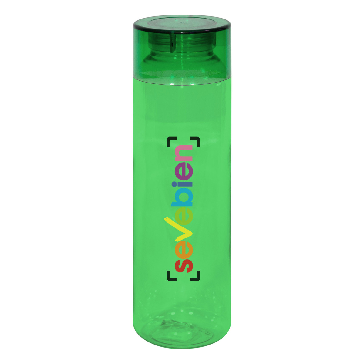 Botella de plástico de colores translúcidos con tapa a rosca plástica.