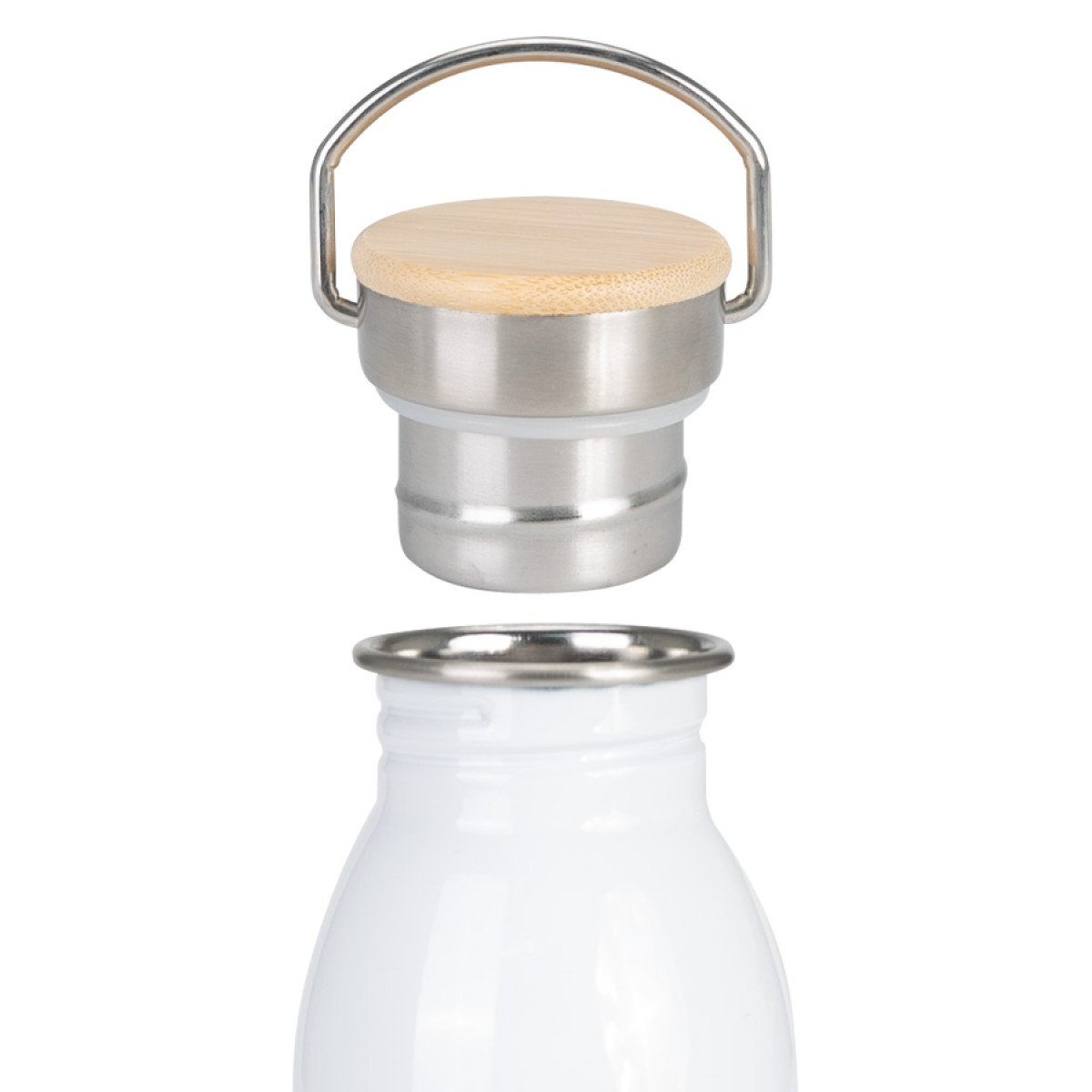 Botella blanca con cuerpo blanco para sublimación, de una sola pared de Acero inoxidable 304 SS. Producto BPA FREE, para el contacto con líquidos y alimentos. Tapa rosca de Acero inoxidable 304 SS y bamboo, con gancho de sujeción de Acero inoxidable 304 SS. Capacidad 750ml. Presentación en bolsa plástica + caja de regalo de cartón blanco. OJO: esta botella NO es térmica, se recomienda usar sólo con líquidos fríos. No llenar con lácteos o bebidas gaseosas.