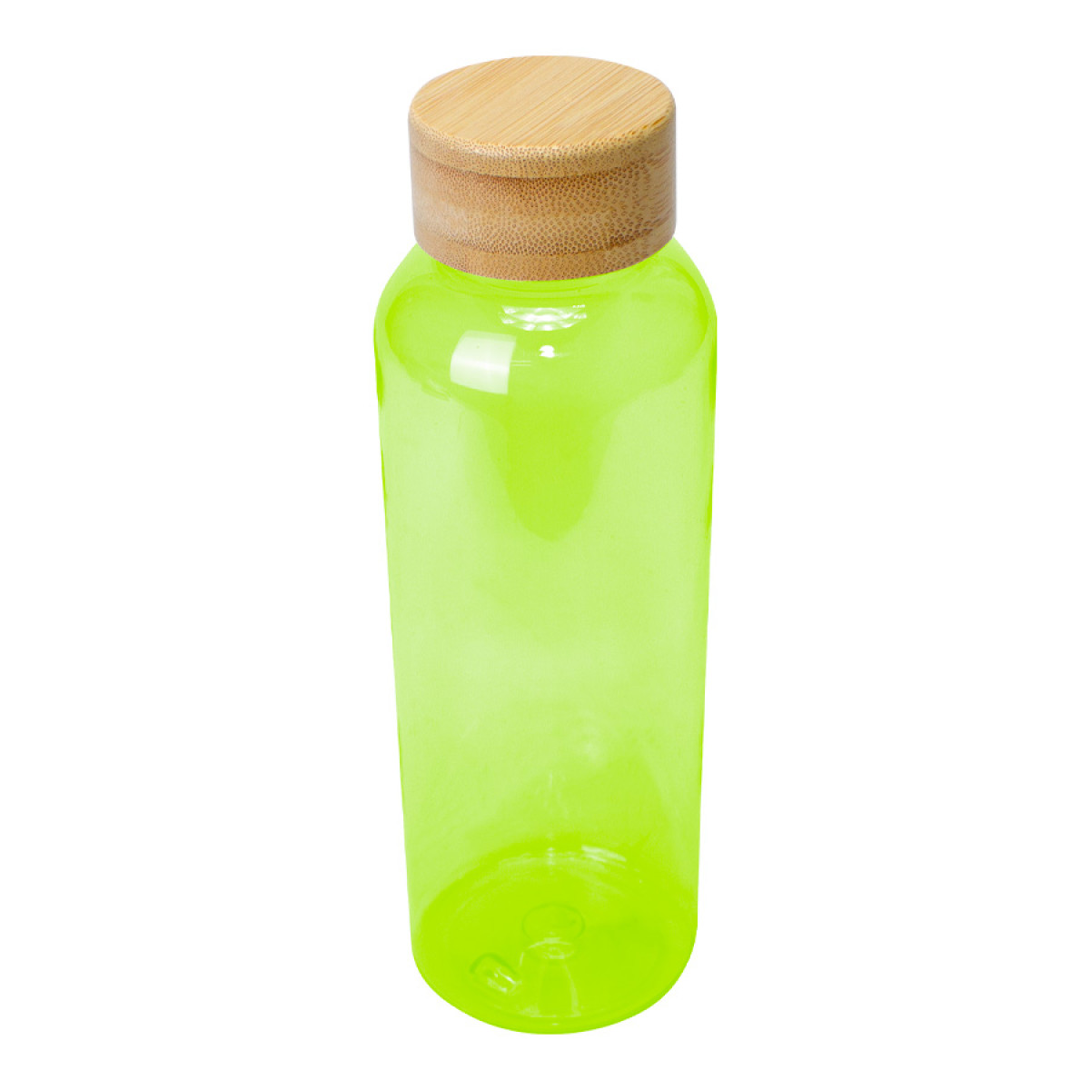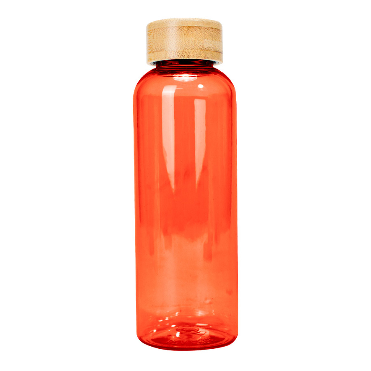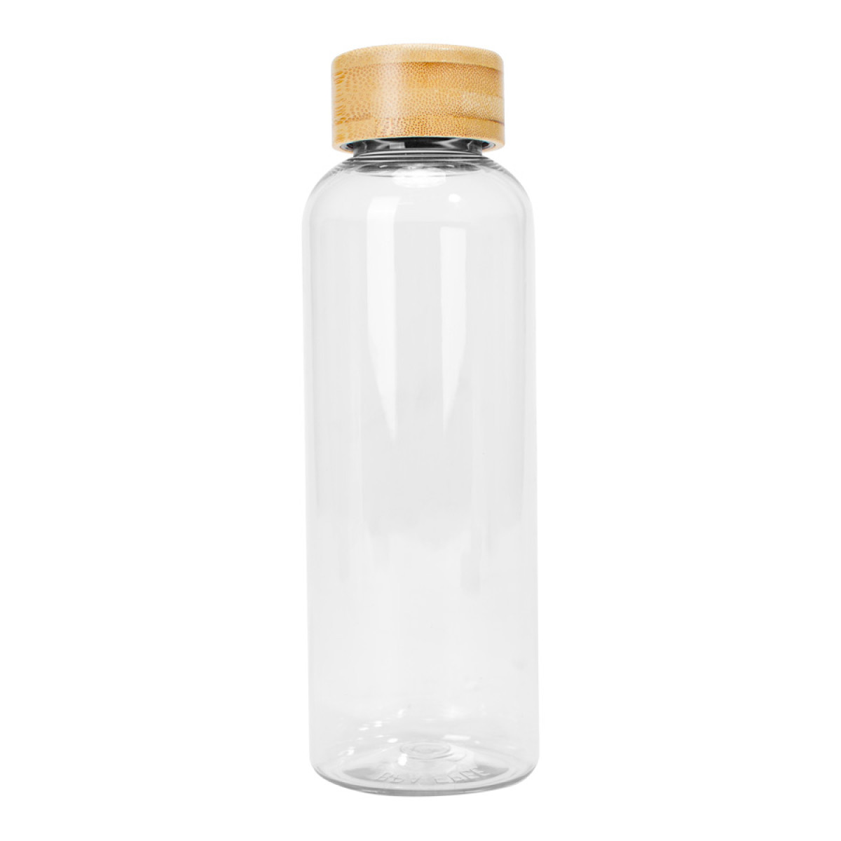 Botella plástica PET color translúcido, con tapa redonda twist-off de Bamboo, modelo "AINOA". Producto BPA FREE, para el contacto con líquidos y alimentos. Capacidad 550ml. Presentación en bolsa OPP + caja de regalo de cartón kraft.