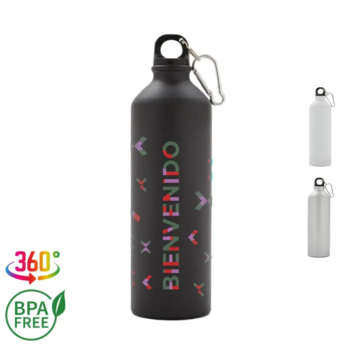 Botella de aluminio con tapa anti-derrame a rosca, Incluye gancho carabinero. Producto libre de BPA. Capacidad: 750 ml. Las botellas en color Negro y Blanco son Mate, La botella gris tiene aspecto metálico. El producto se presenta en una bolsa de PLA 100% compostable.