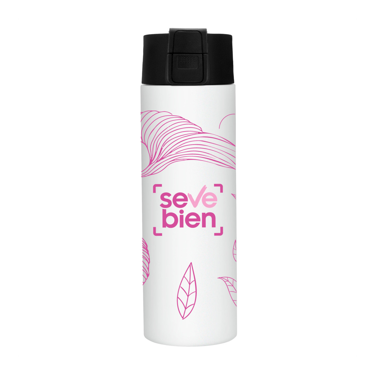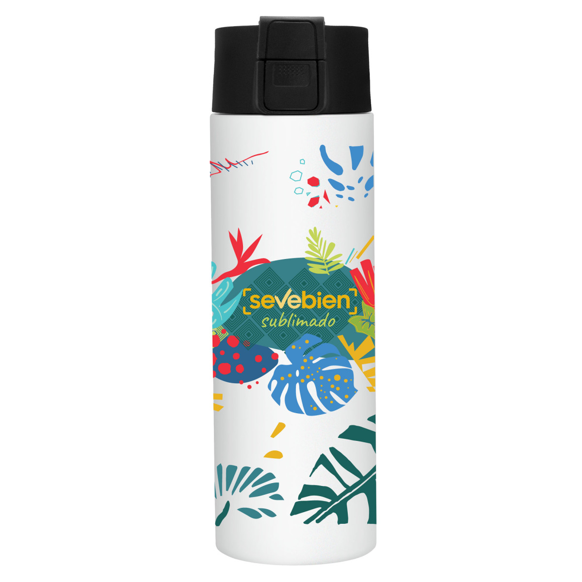 Ø 7 cm x 23 cm. Acero inoxidable. Capacidad 450 ml. Botella doble pared, sellada al vacío. Interior de acero 304 y exterior de acero 201. Pintura color blanco brillante apta para sublimado. Tapa en polipropileno con traba de seguridad y botón pulsador de apertura. Mantiene por más de 12 hs la temperatura de las bebidas calientes y 24 hs de las bebidas frías. Presentación en caja de regalo kraft.