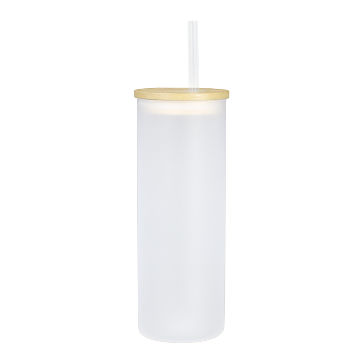 Botella de Vidrio Borosilicato para Sublimación, para líquidos fríos, con tapa de Bamboo y bombilla plástica empavonada. Capacidad 500cc. Presentación bolsa plástica empavonada + caja de cartón blanco. Calidad Premium ORCA.