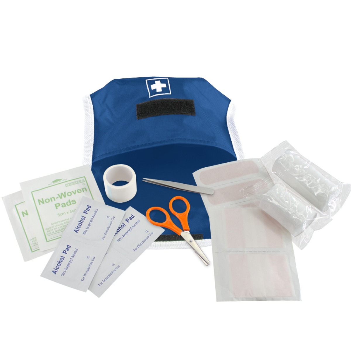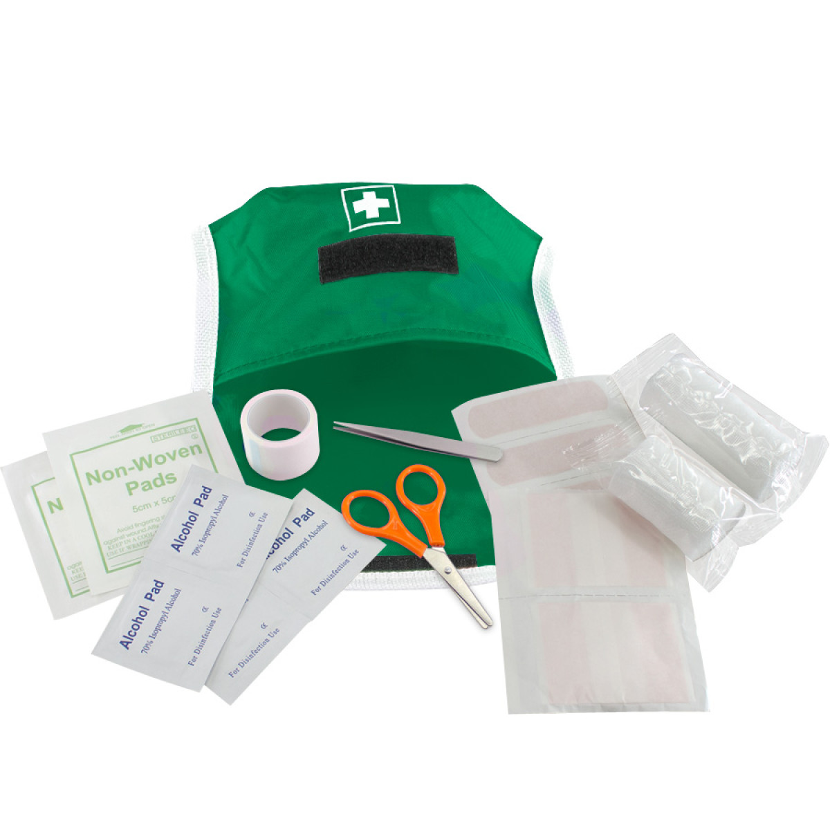 1 Tijera, 1 Pinza, 1 Rollo de Gasa elasticada de 3 x 7 cm, 1 Rollo de Gasa elasticada de 3 x 5 cm, 4 Toallas Húmedas con alcohol gel, 1 Cinta Adhesiva, 2 Parches Curitas de 6 x 5 cm, 2 Parches de Gasa estériles de 5 x 5 cm, 4 Parches Curitas bordes redondeados de 7 x 2 cm.