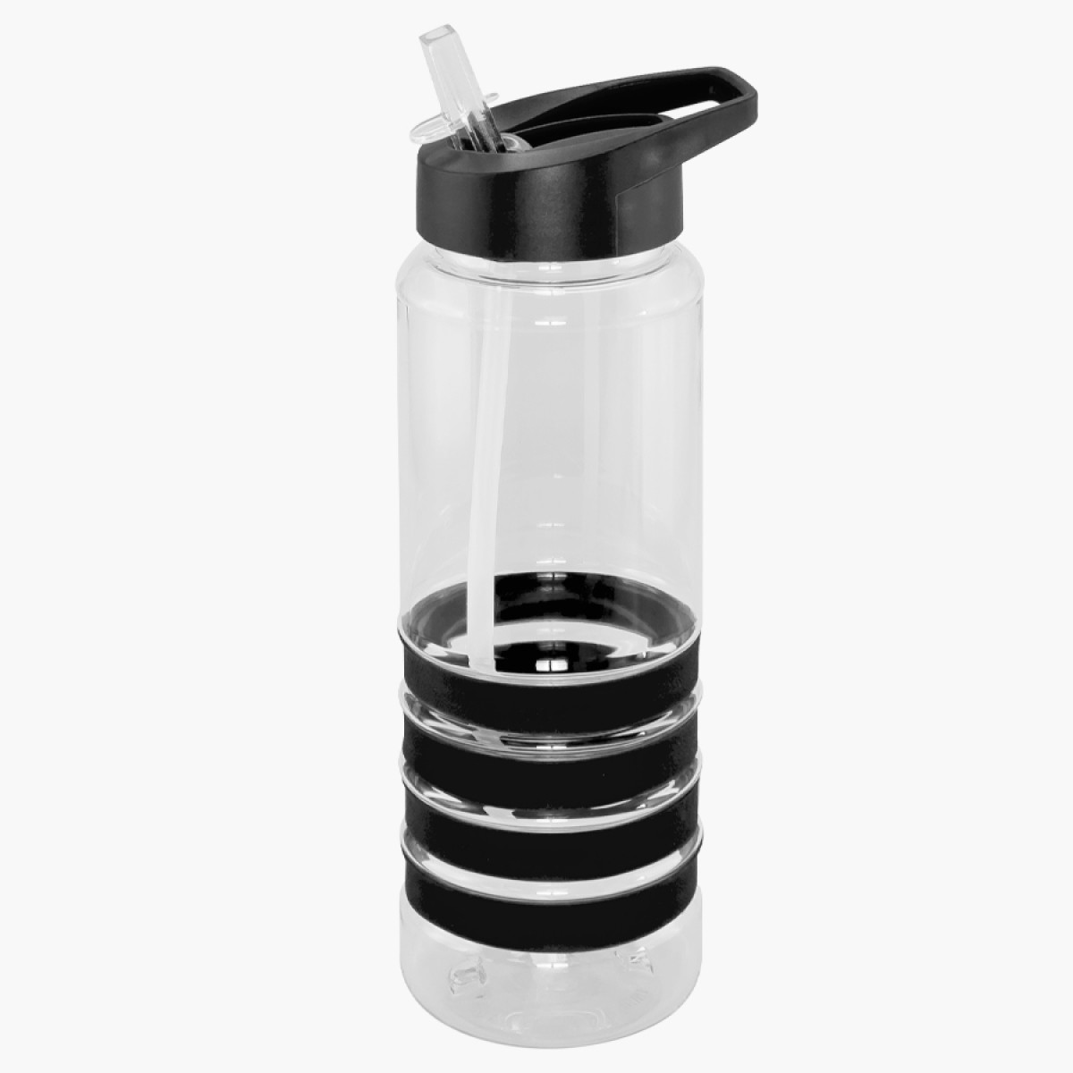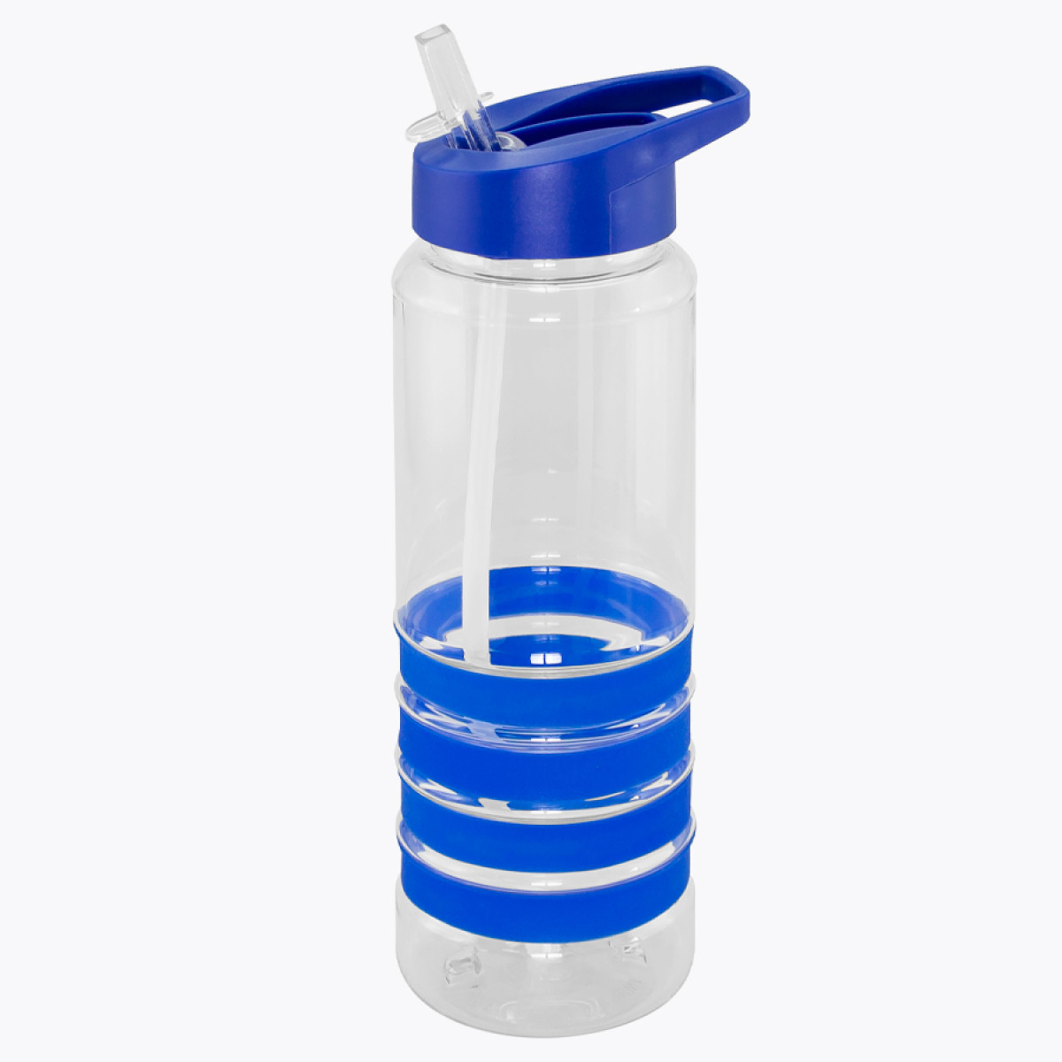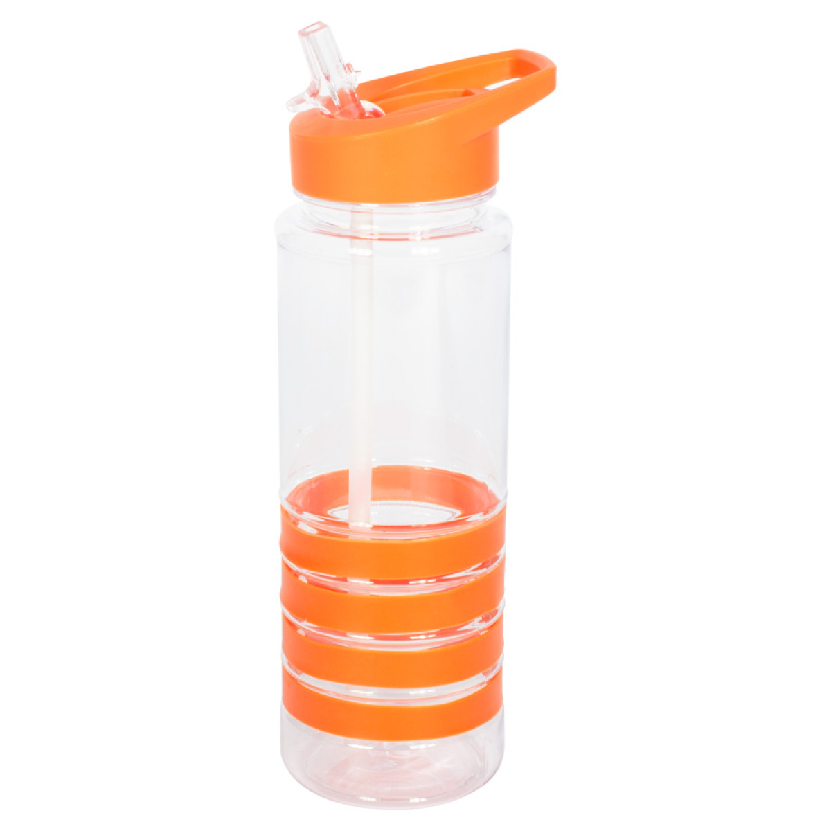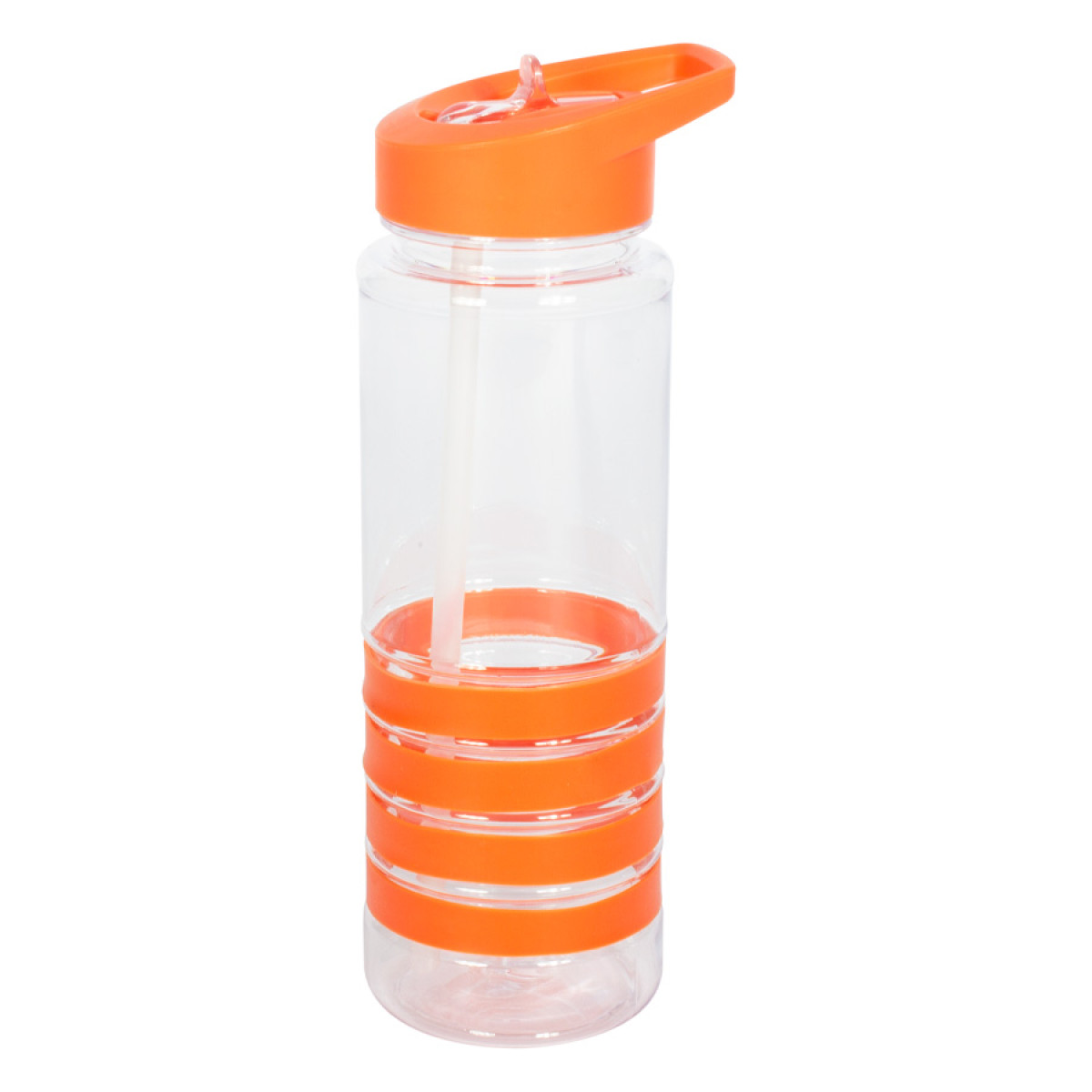 Botella deportiva modelo "Tritan", de plástico rígido traslúcido Tritan con 4 anillos de silicona de color. Tapa de plástico PP de color con bebedero retráctil. Incuye bombilla plástica en el interior. Para líquidos fríos (no térmico).