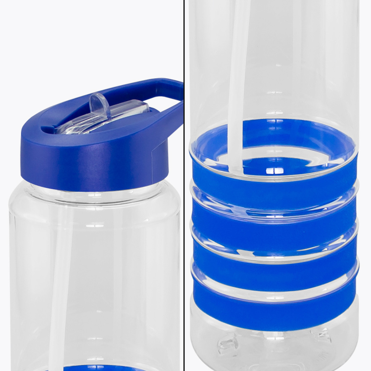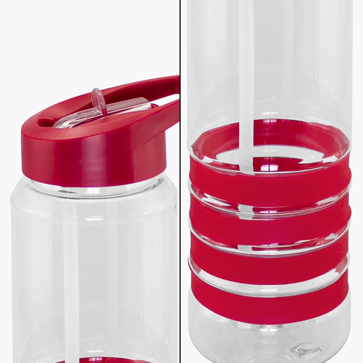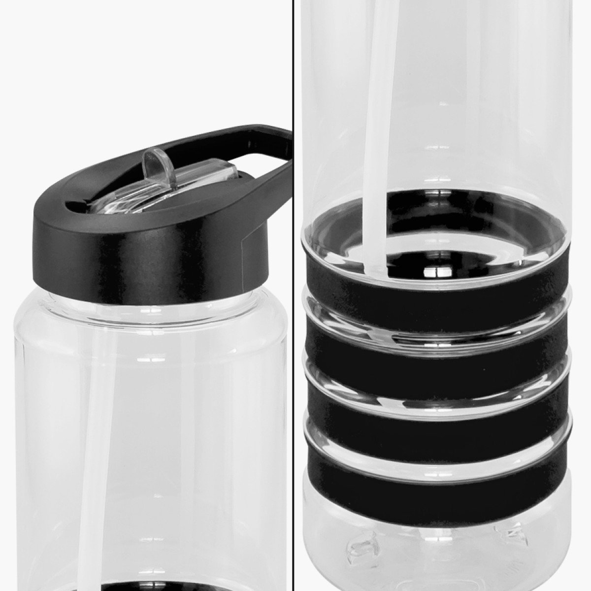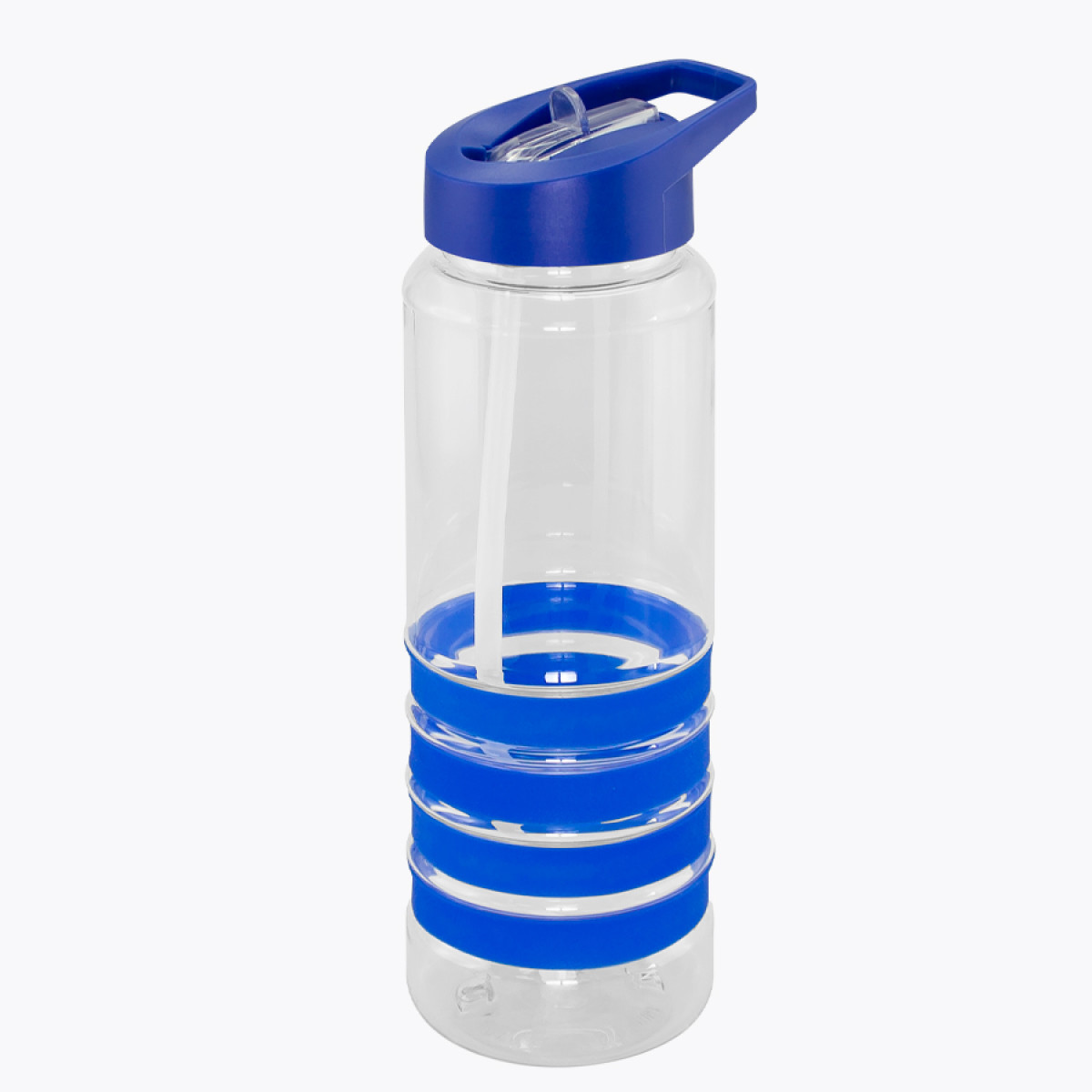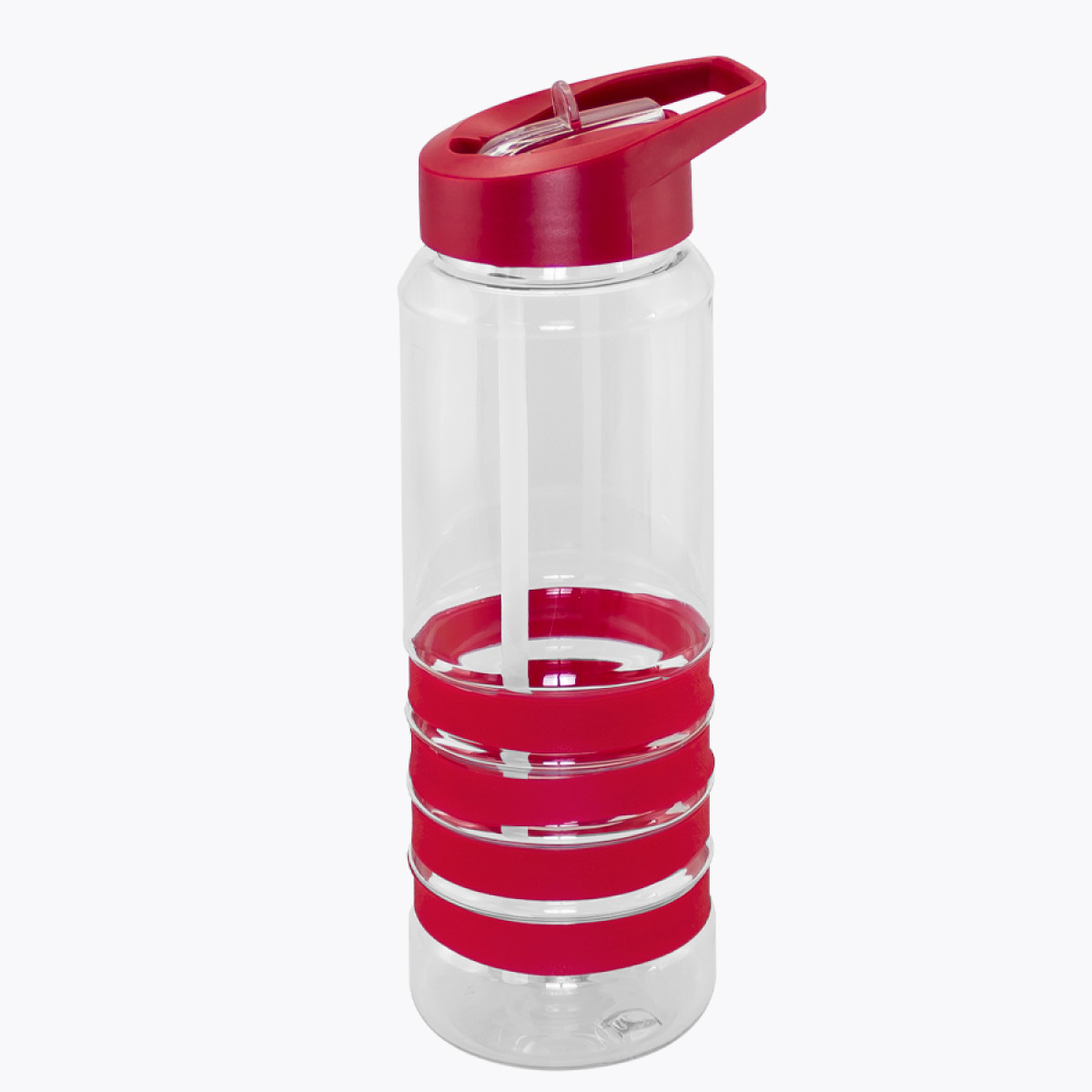Botella deportiva modelo "Tritan", de plástico rígido traslúcido Tritan con 4 anillos de silicona de color. Tapa de plástico PP de color con bebedero retráctil. Incuye bombilla plástica en el interior. Para líquidos fríos (no térmico).