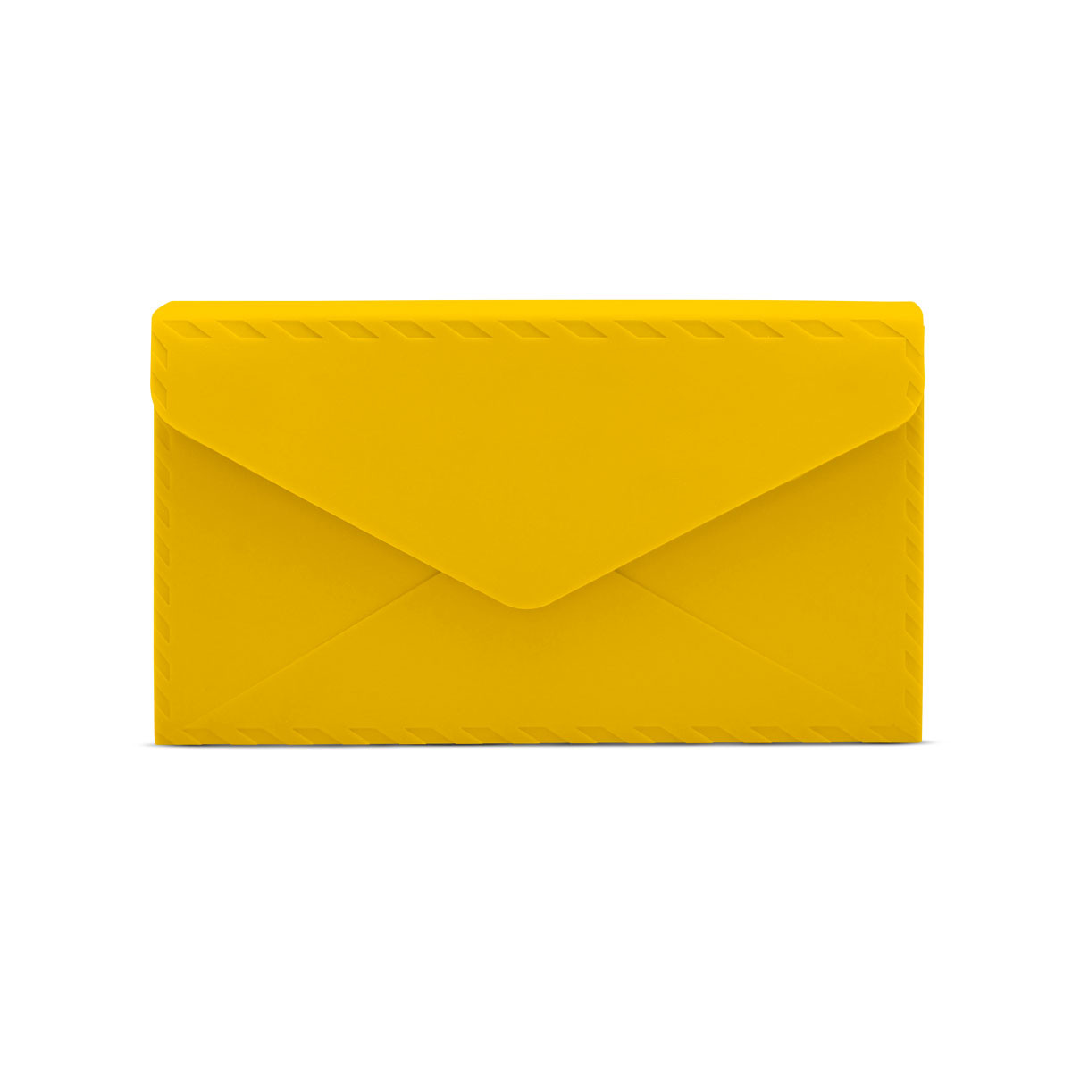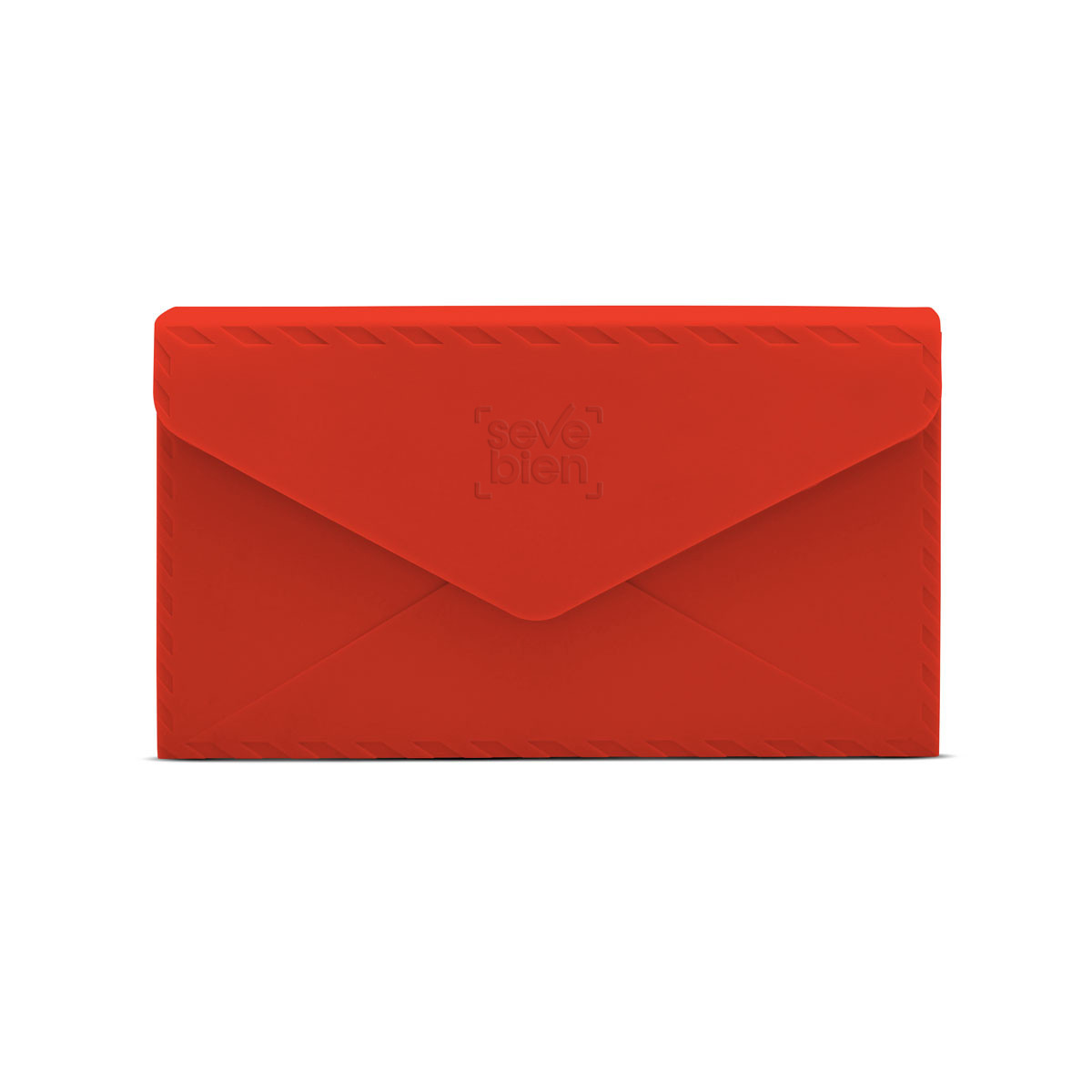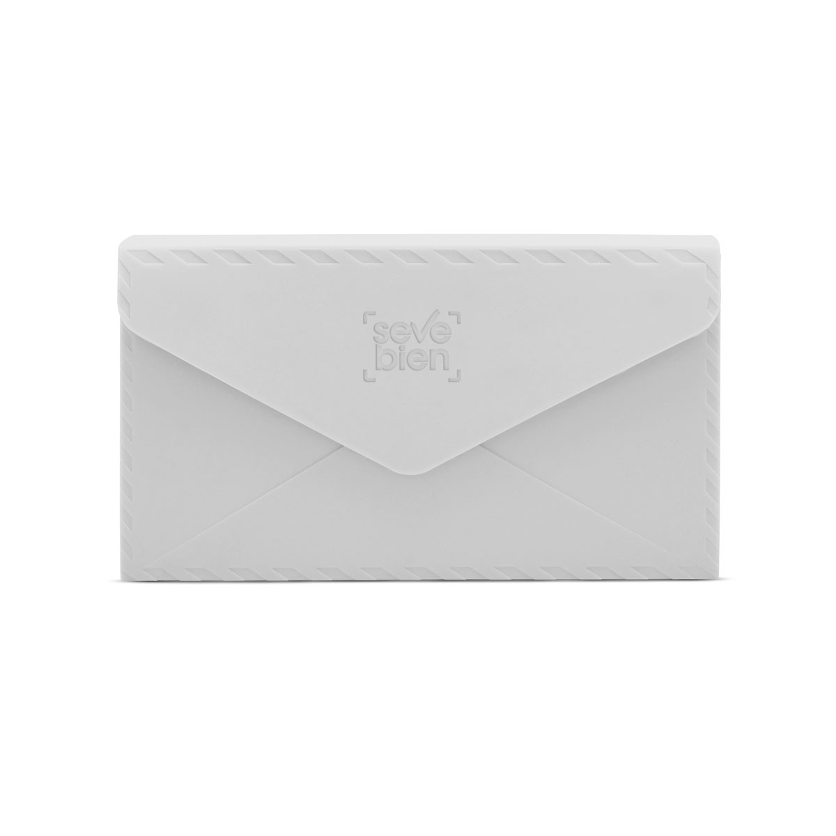21,5 x 12,2 x 5 cm. Silicona. Cartera de mano en forma de sobre con solapa imantada y correa desmontable. Presentación en caja de regalo.
