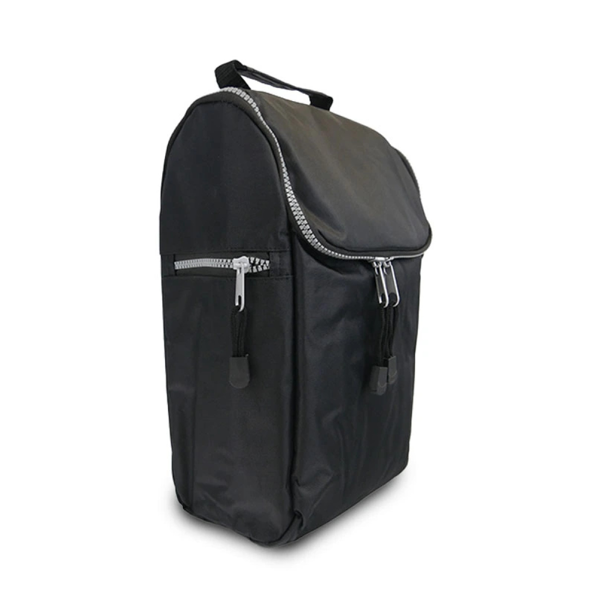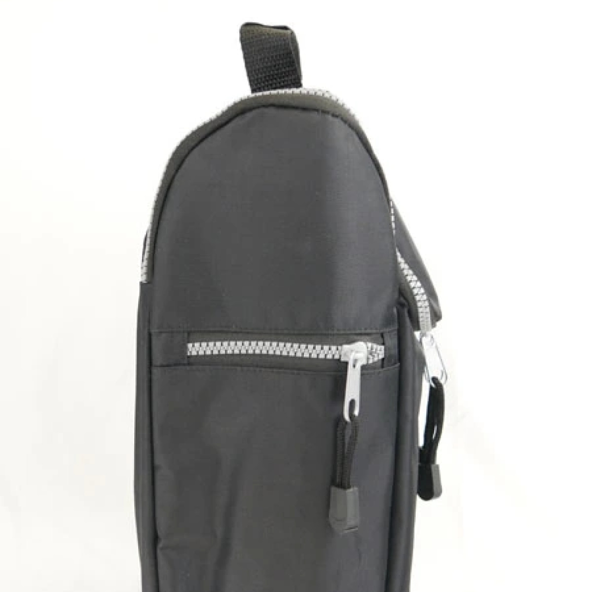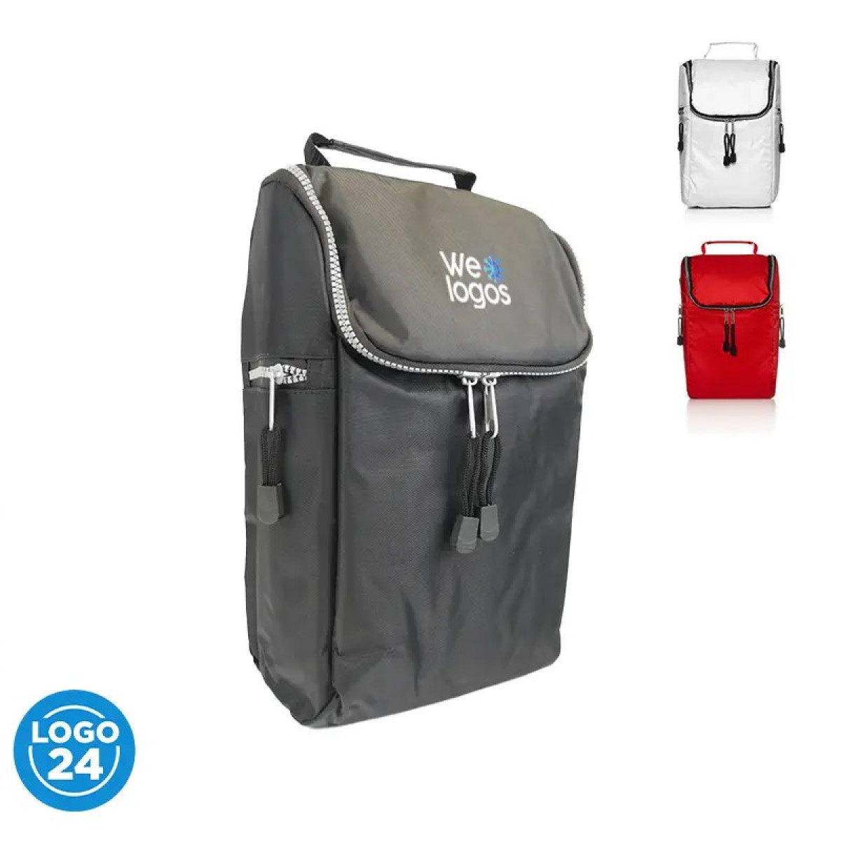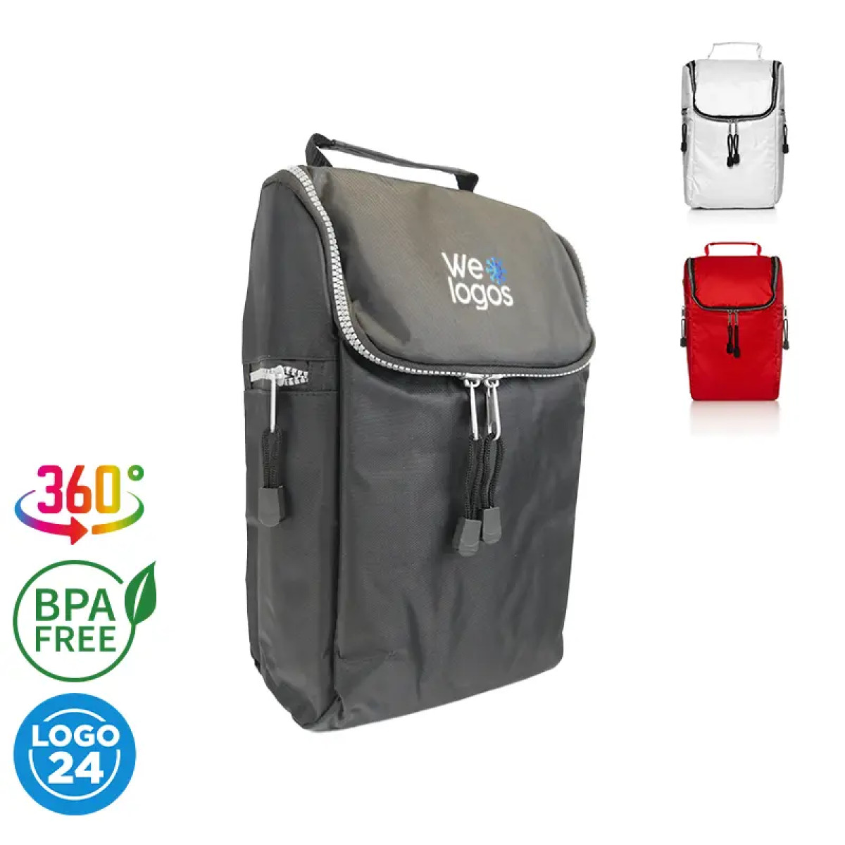 Cooler confeccionado en tela Nylon 600D, interior térmico forrado en PVC gris. Bolsillos laterales. Apto para llevar botellas, termos y otros.