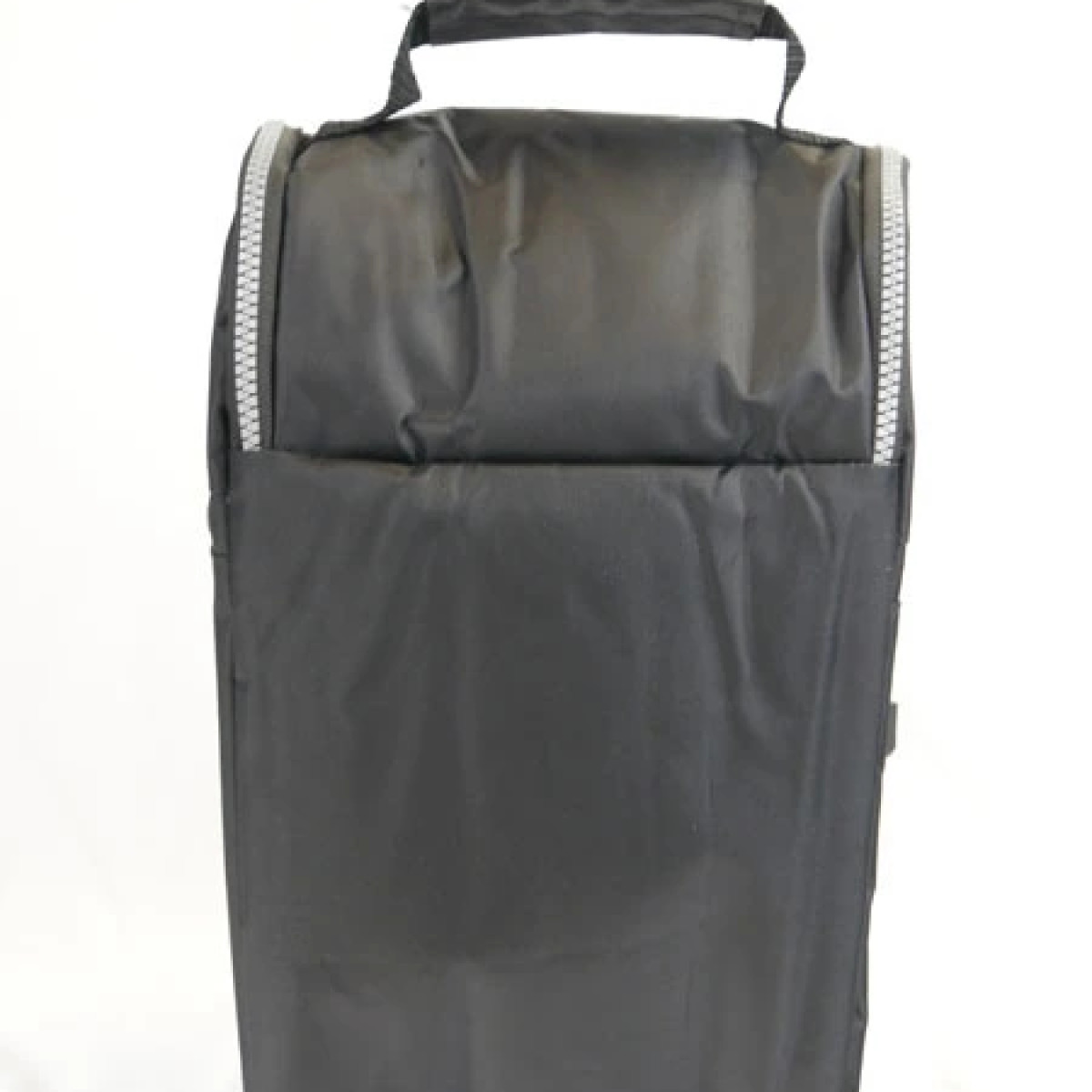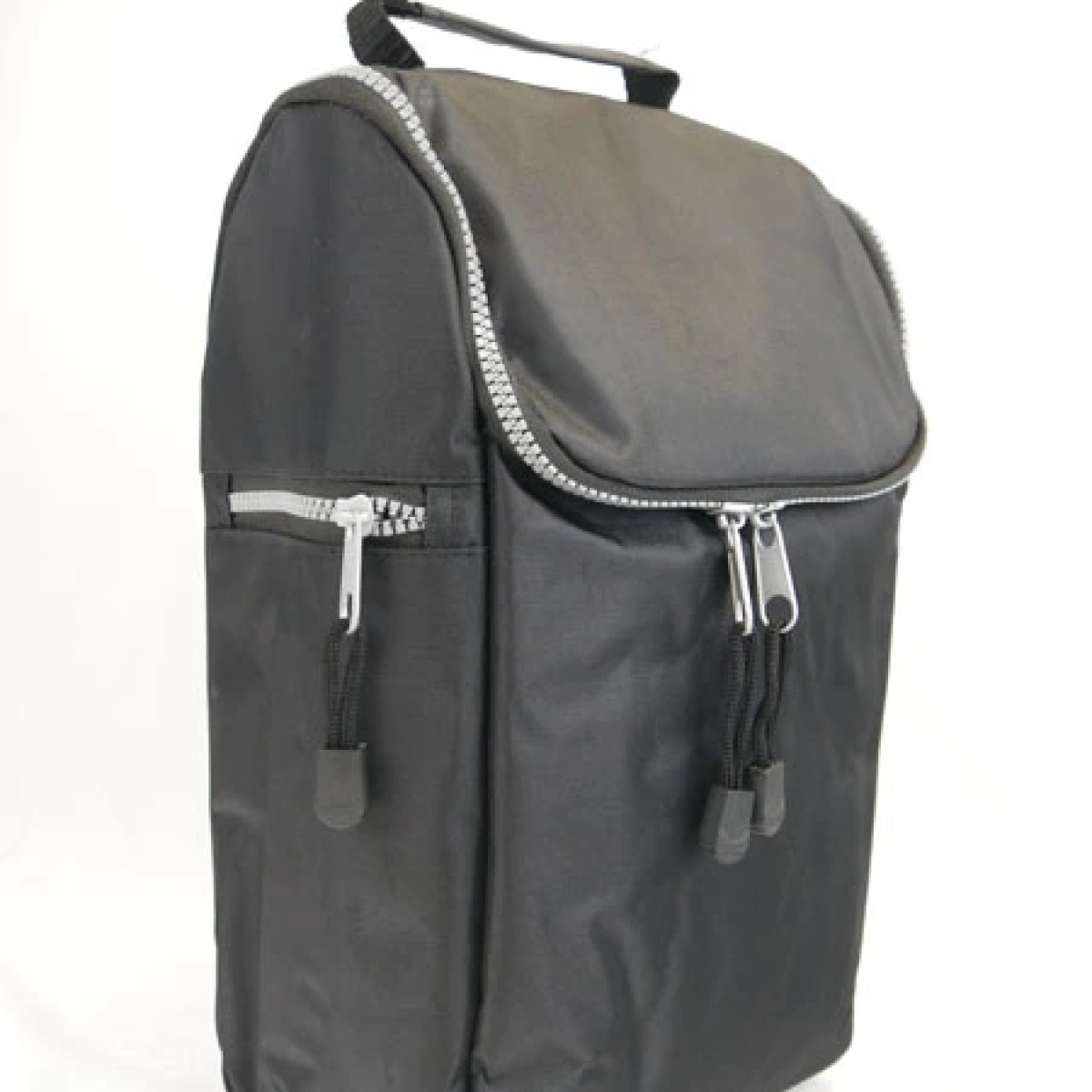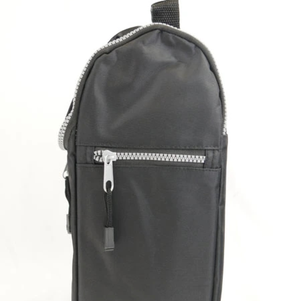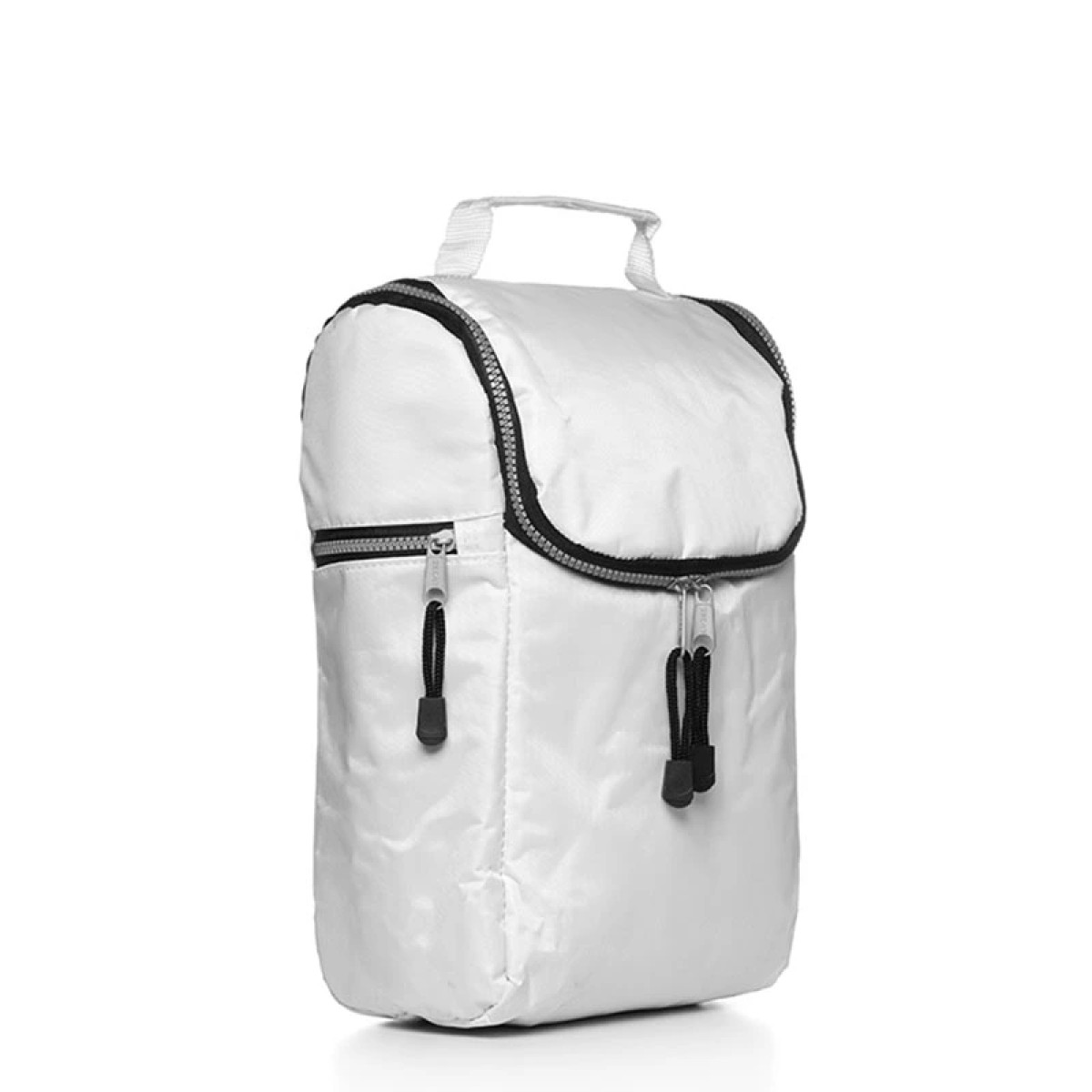 Cooler confeccionado en tela Nylon 600D, interior térmico forrado en PVC gris. Bolsillos laterales. Apto para llevar botellas, termos y otros.