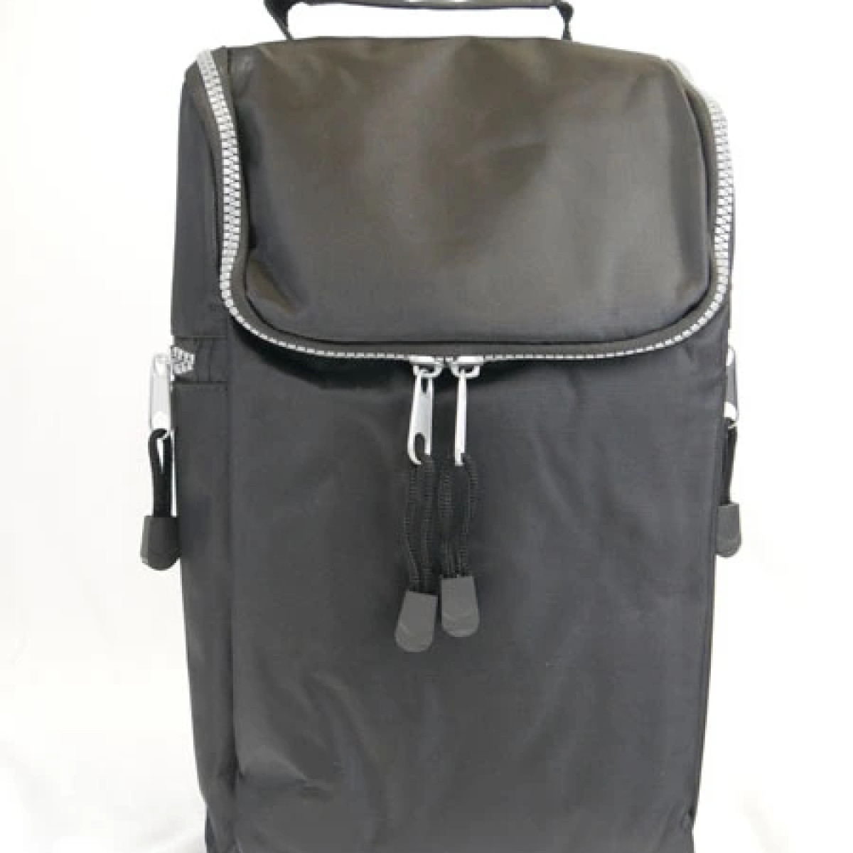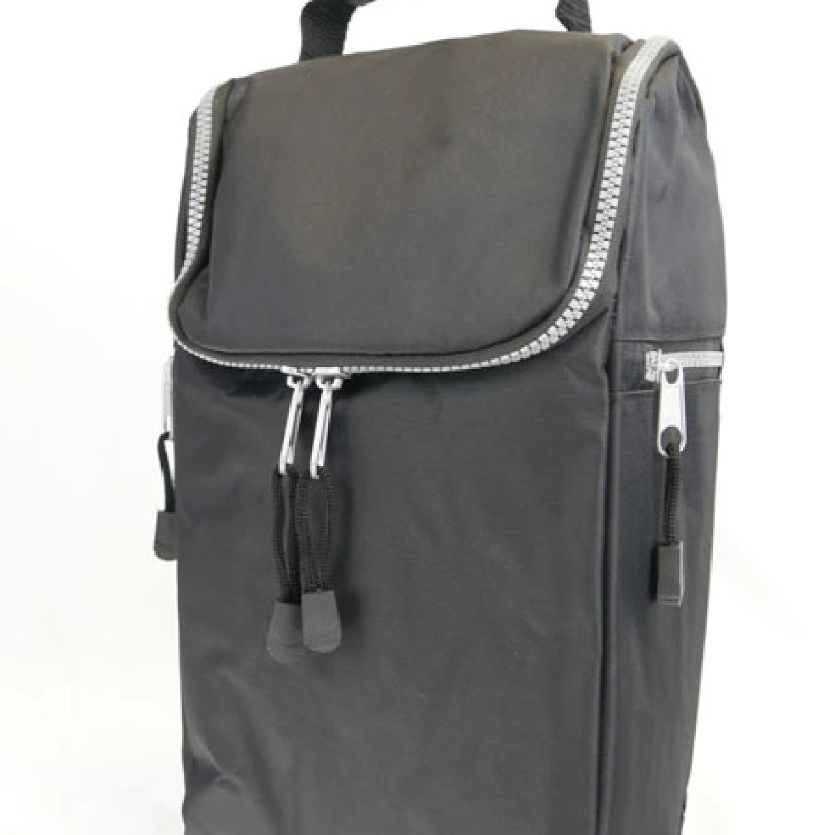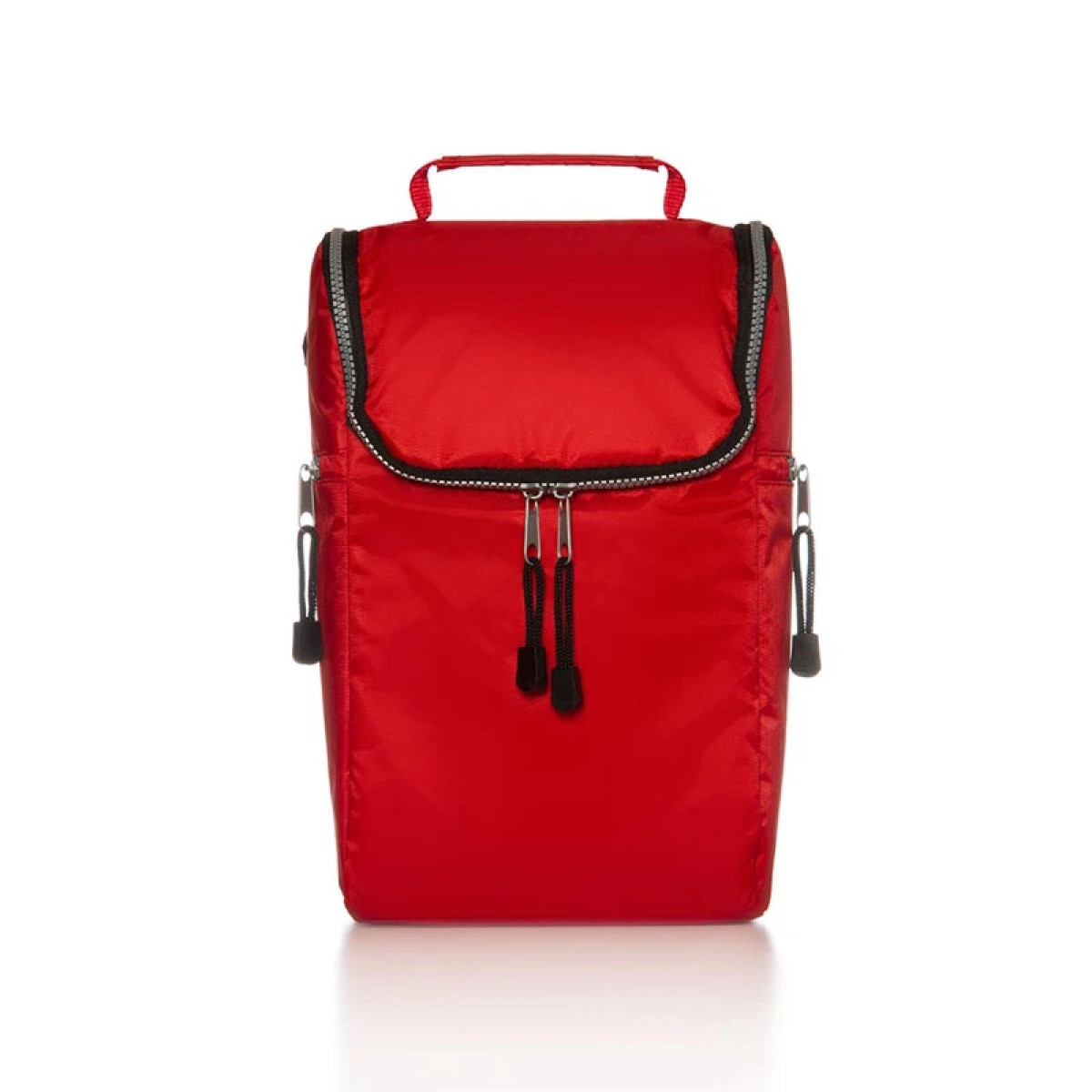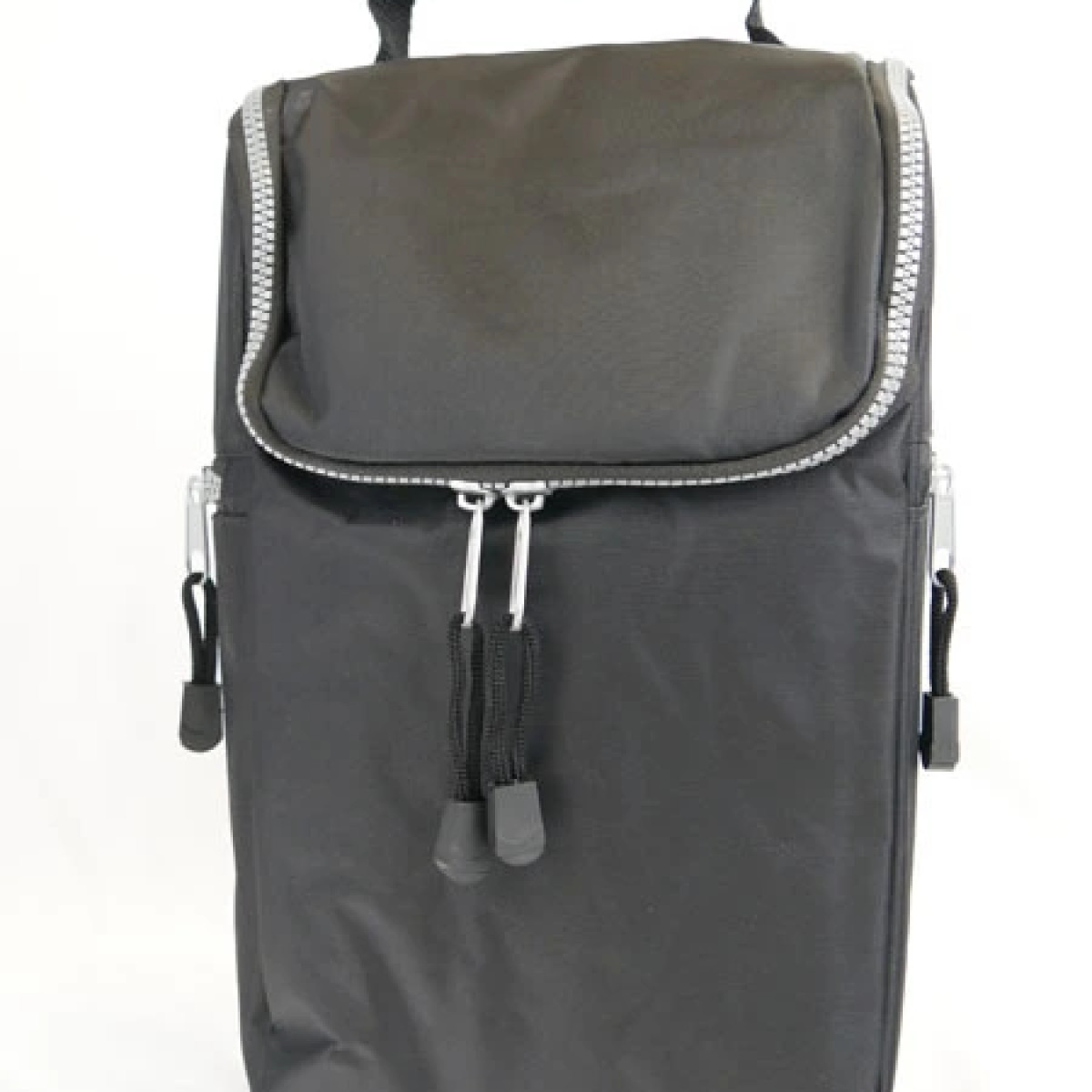 Cooler confeccionado en tela Nylon 600D, interior térmico forrado en PVC gris. Bolsillos laterales. Apto para llevar botellas, termos y otros.