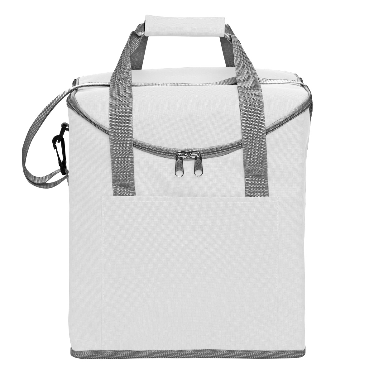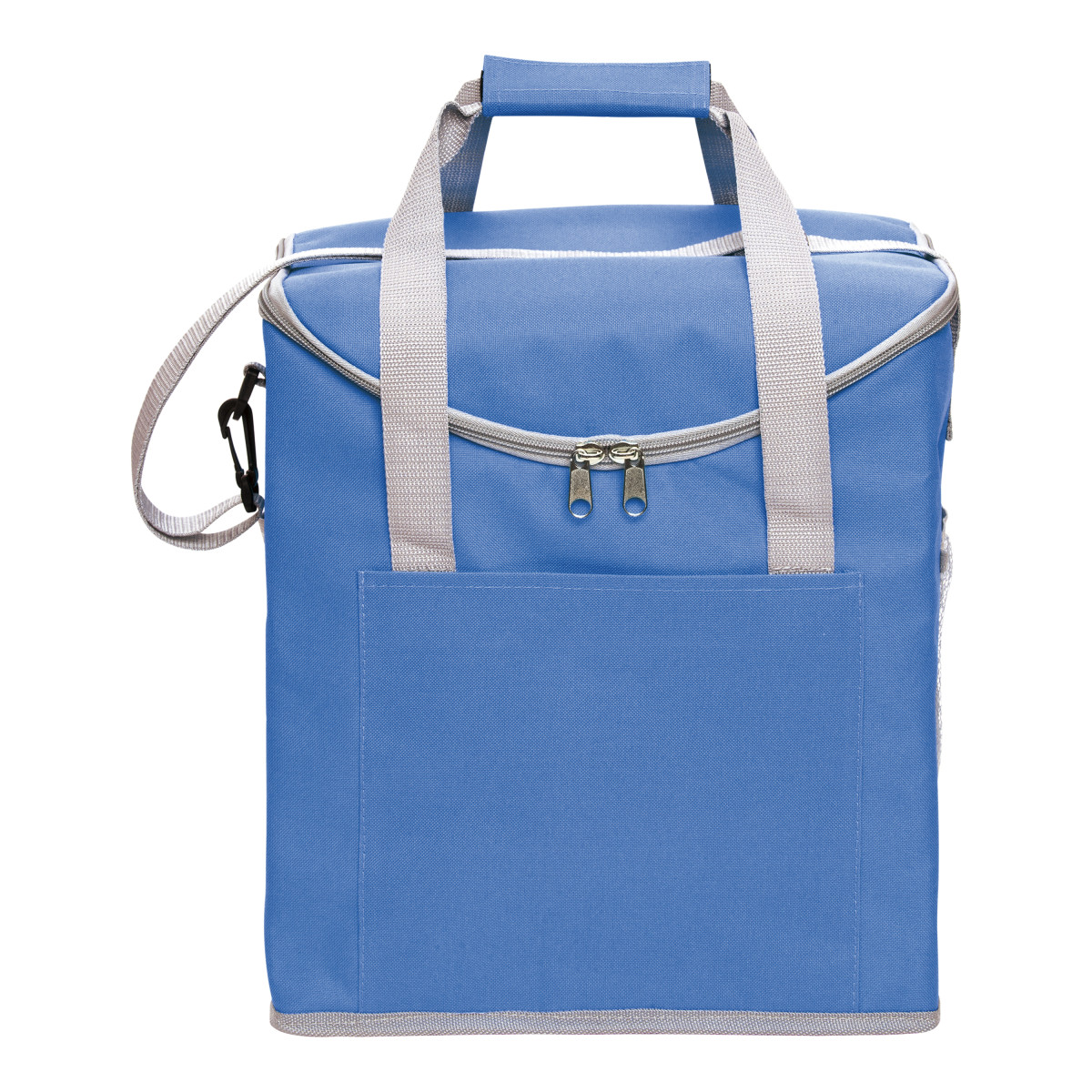 30 x 34 x 19,5 cm. Capacidad 37 litros. Poliéster. 600D Lonchera térmica con recubrimiento interior metalizado. Un bolsillo frontal y dos bolsillos laterales de red. Correa tipo bandolera y dos manijas reforzadas con cierre de velcro. Capacidad hasta 6 botellas de 2,5 litros