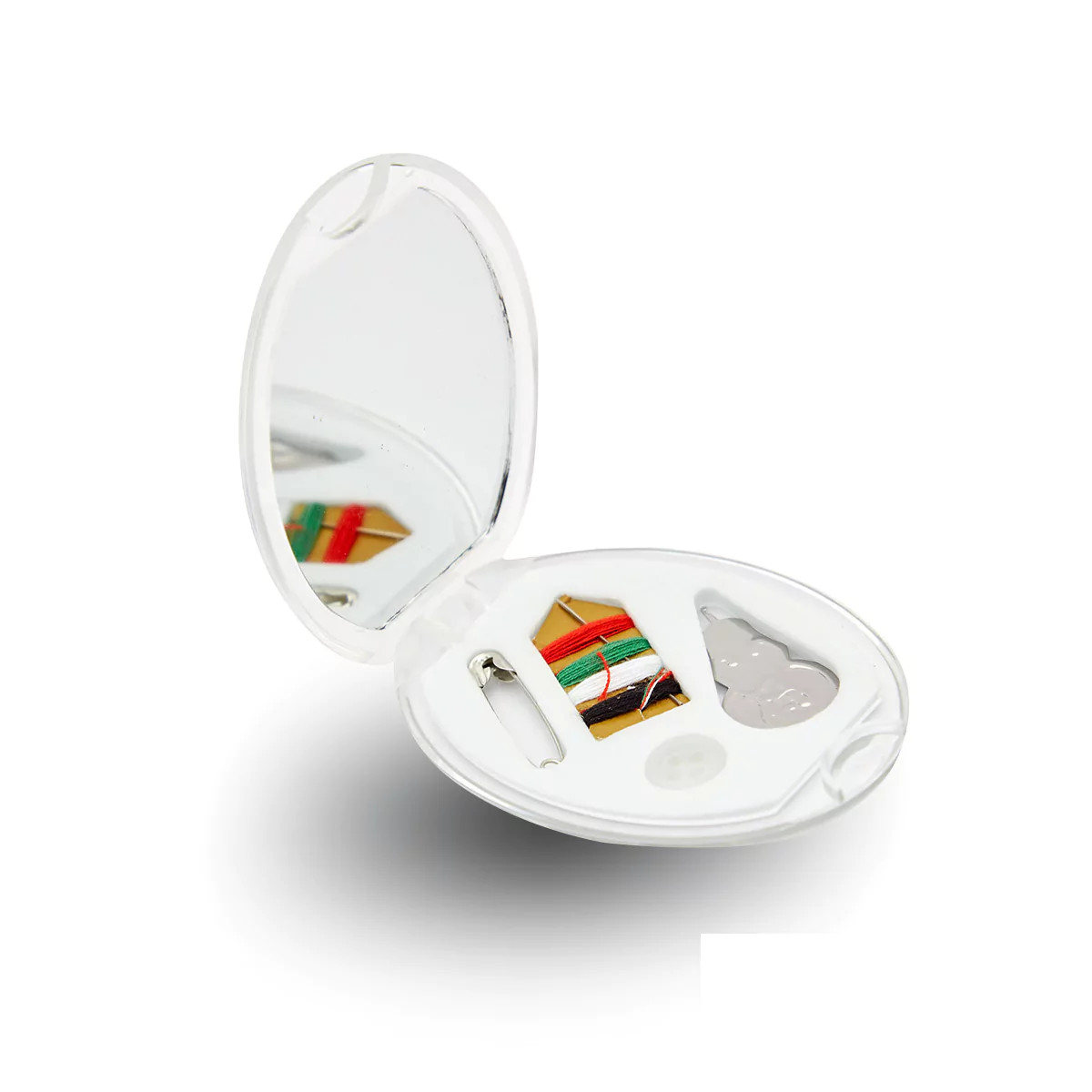 Mini costurero de viaje de plástico Incluye: Espejo, aguja con 4 tonos de hilo, botón y alfiler de gancho. Medidas: 5,5 x 8 cm. Próximos arribos: las fechas, y cantidades de entregas son estimativas y están sujetas a cambios.