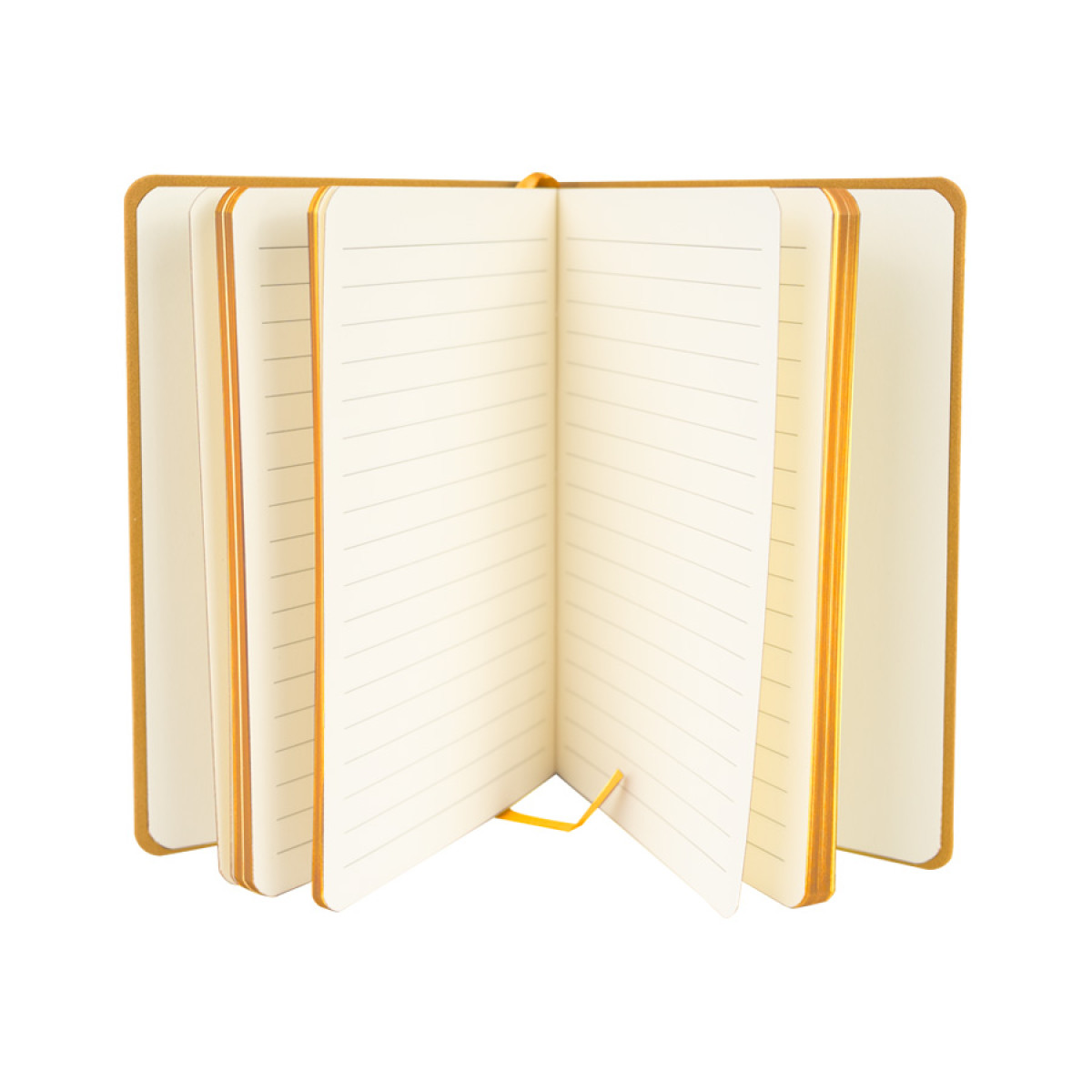 Cuaderno tamaño A5, con cubierta de PU eco-cuero de 2mm de espesor y lomo pintado de color al tono. Interior 80 hojas lineadas amarillas de 80gsm. Incluye banda separador de hojas al tono. Presentación individual en bolsa de polipropileno.