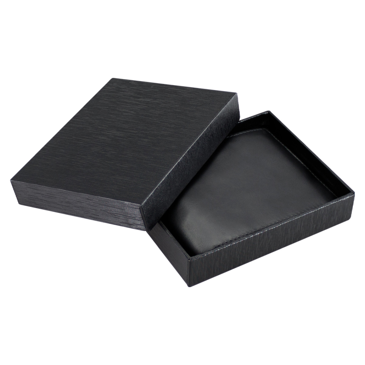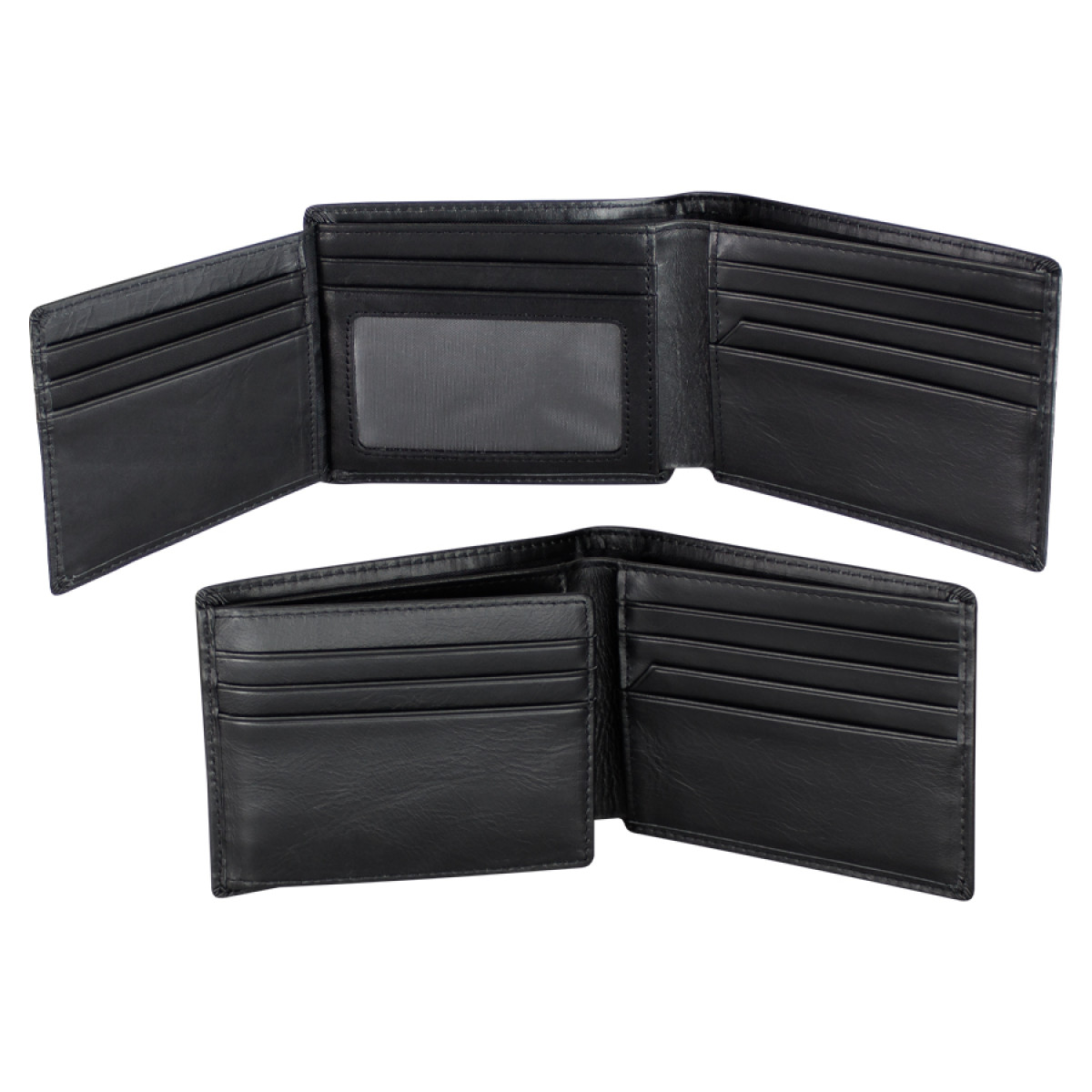Deluxe Billetera de cuero natural liso Negro. Finas terminaciones. 16 compartimentos interiores (3 secciones). Alta resistencia al uso. Presentación en bolsa frozen y caja de cartón forrado negro texturado.