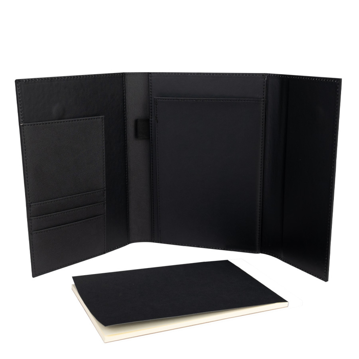 Libreta de Apuntes con 50 hojas lisas amarillas de 13.5 x 20.5 cm., presentada dentro de fina carpeta de PU negro con interior porta-documentos, porta-bolígrafo y cierre imantado, protegida por lámina de tela no tejida color negro. Presentación en elegante caja de cartón piedra esmaltado negro y funda de papel negro. Un gran regalo para nivel ejecutivo.