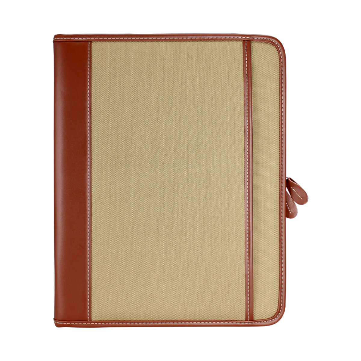 Deluxe Carpeta ejecutiva modelo "Windsor" en Eco-Cuero café y polyester café claro. Incluye bolsillo delantero. En el interior contiene Block de 20 hojas lineadas color beige, Bolsillo grande para documentos, Bolsillo con Cierre, Porta-Bolígrafo y Compartimentos para Tarjetas. Forrada en fina tela escocesa.