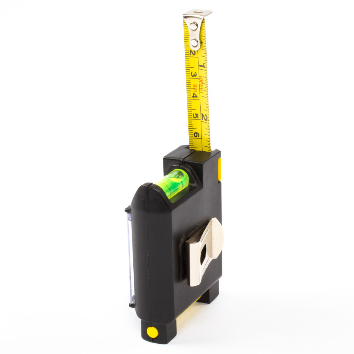 Huincha de medir (metálica-rígida) de 3 mts multifunción. Incluye lápiz pasta, notas adhesivas para apuntes, nivel y abrasadera para bolsillo o cinturón.