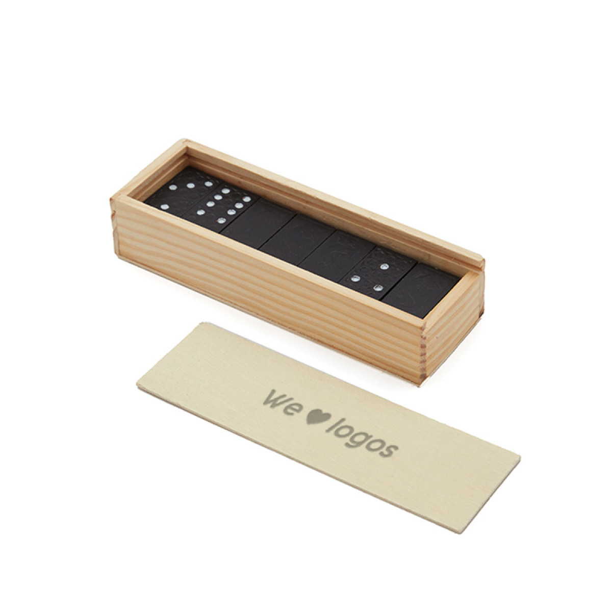 Juego Dominó, ideal para jugar en familia. Promueve la atención y la concentración y estimula el pensamiento lógico. Cuenta con 28 fichas negras ce MDF, bajo relieve con puntos blancos para evitar el desgaste de la pintura. Viene en una caja de madera de 15 x 3 x 5 cm cuya tapa es desplegable.