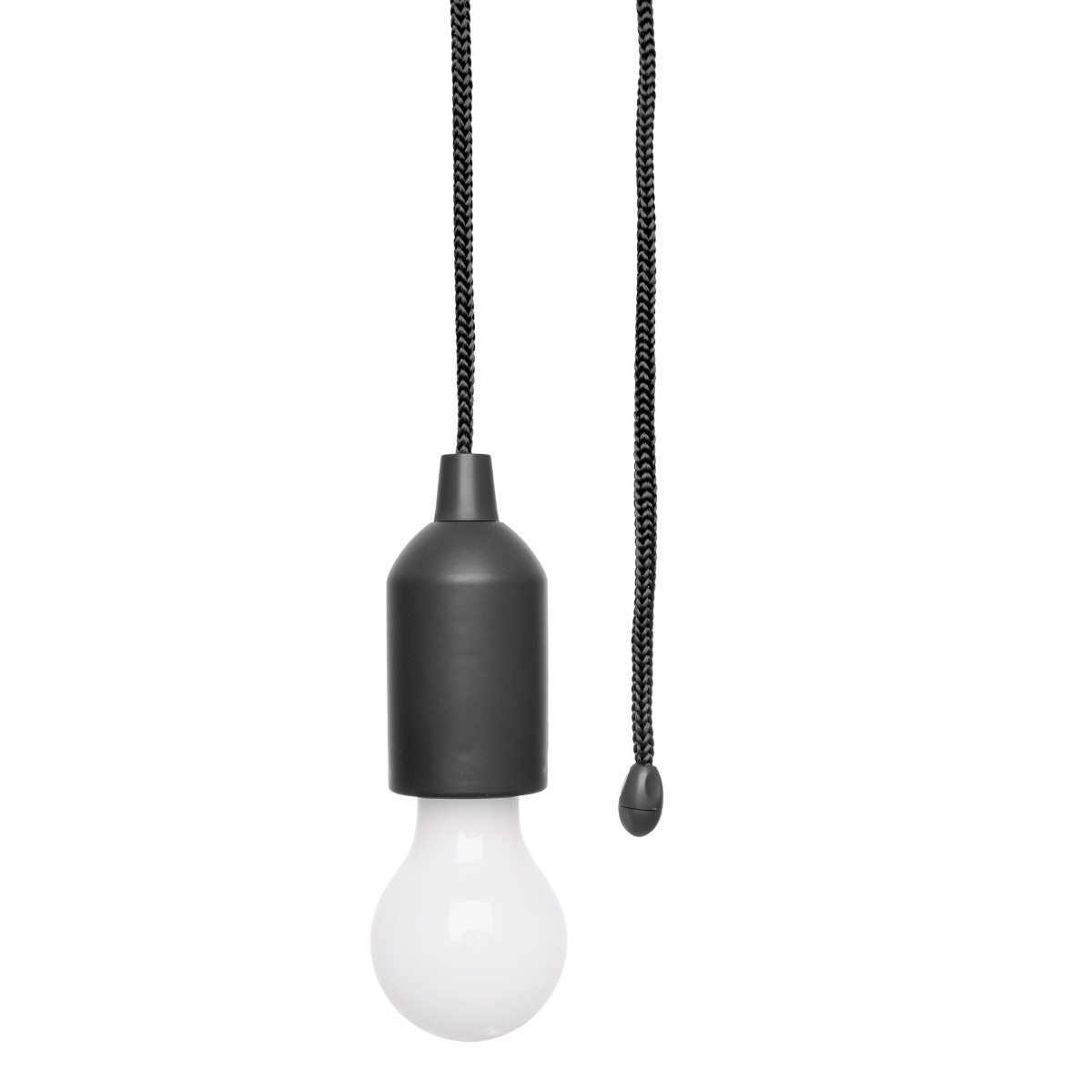 80 cm (largo del cordón). Plástico. Lampara con luz led. Contiene un lazo que al tirarlo enciende y apaga la luz de la bombilla. Utiliza 3 baterías AAA incluidas.
