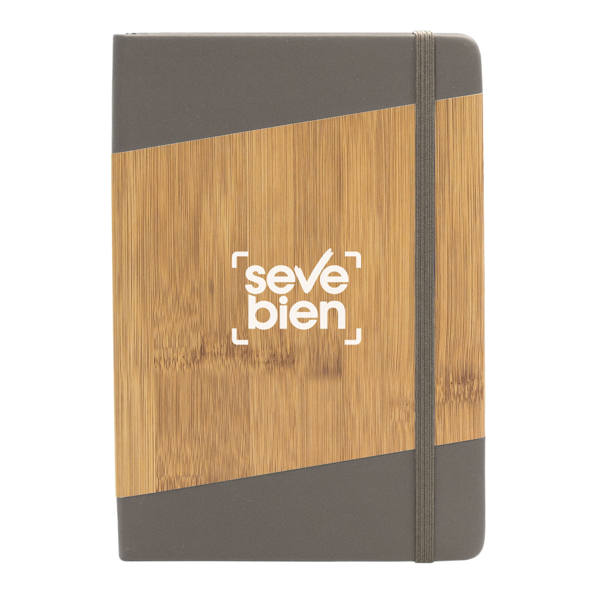 21 x 14 cm. (A5). PU + Papel. Libreta. Tapa dura recubierta en poliuretano, con estampado simil bambú. Interior 80 hojas rayadas en papel de 70 g. Cinta señaladora y cierre con banda elástica del mismo color.