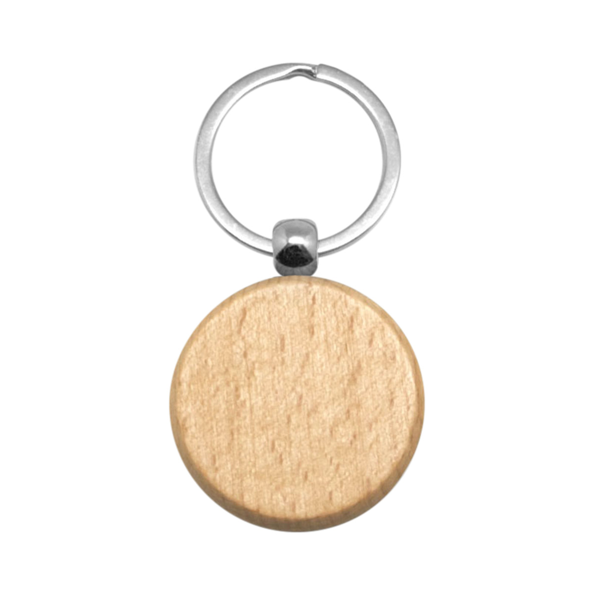Ø 3,1 x 0,5 cm. (La medida no incluye el aro). Madera. Llavero redondo con aro metálico.