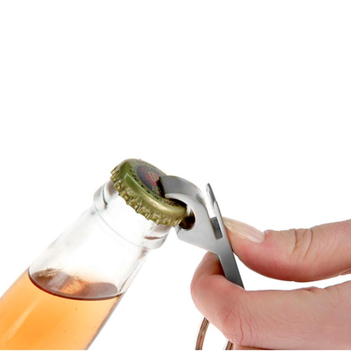 Llavero-Destapador con cuerpo plástico plateado y destapador metálico. Presentación en cajita plateada.