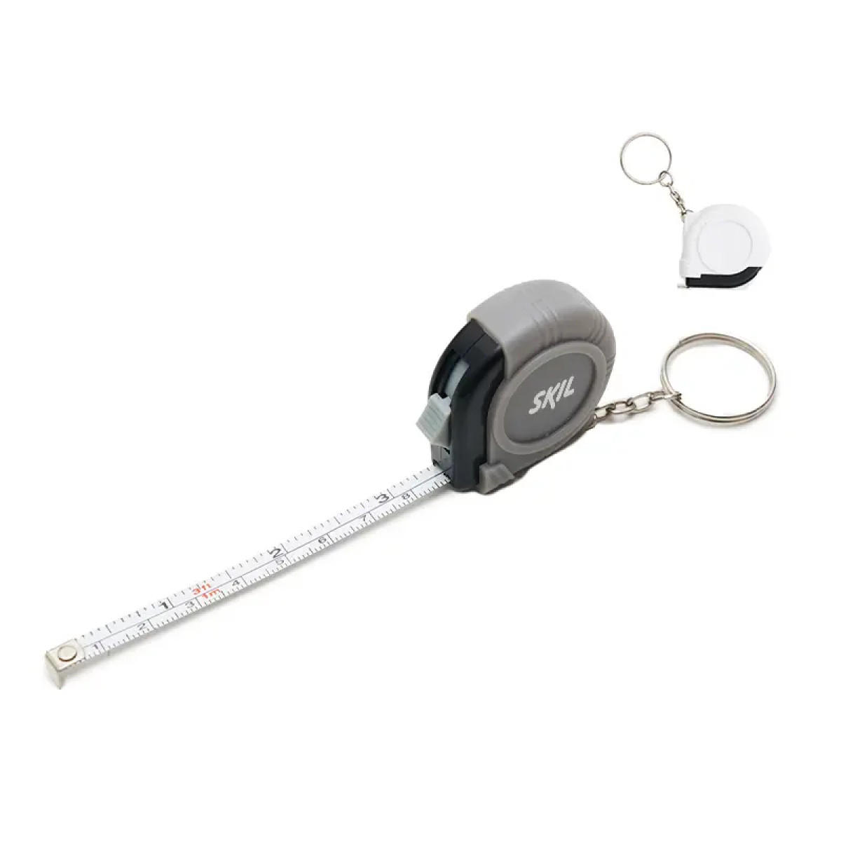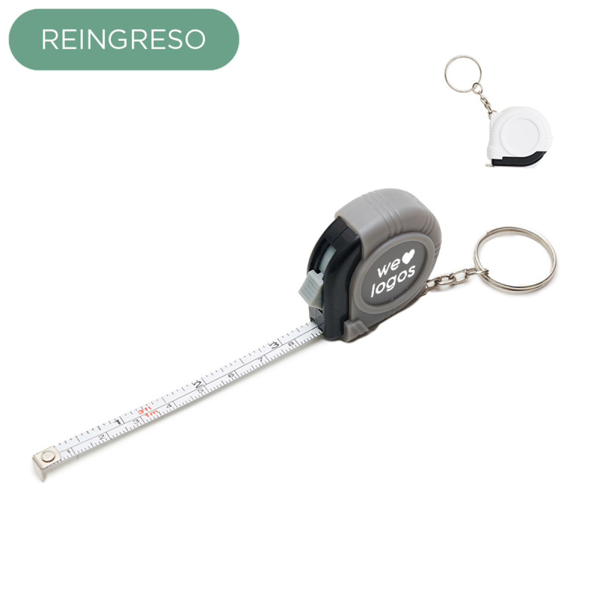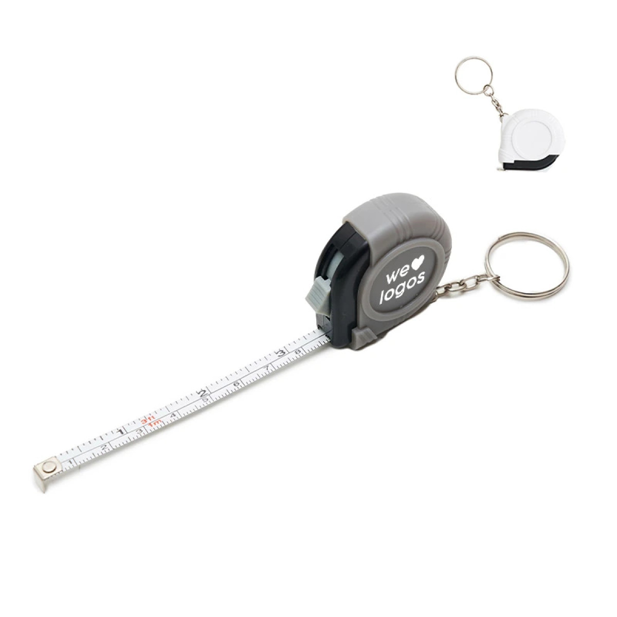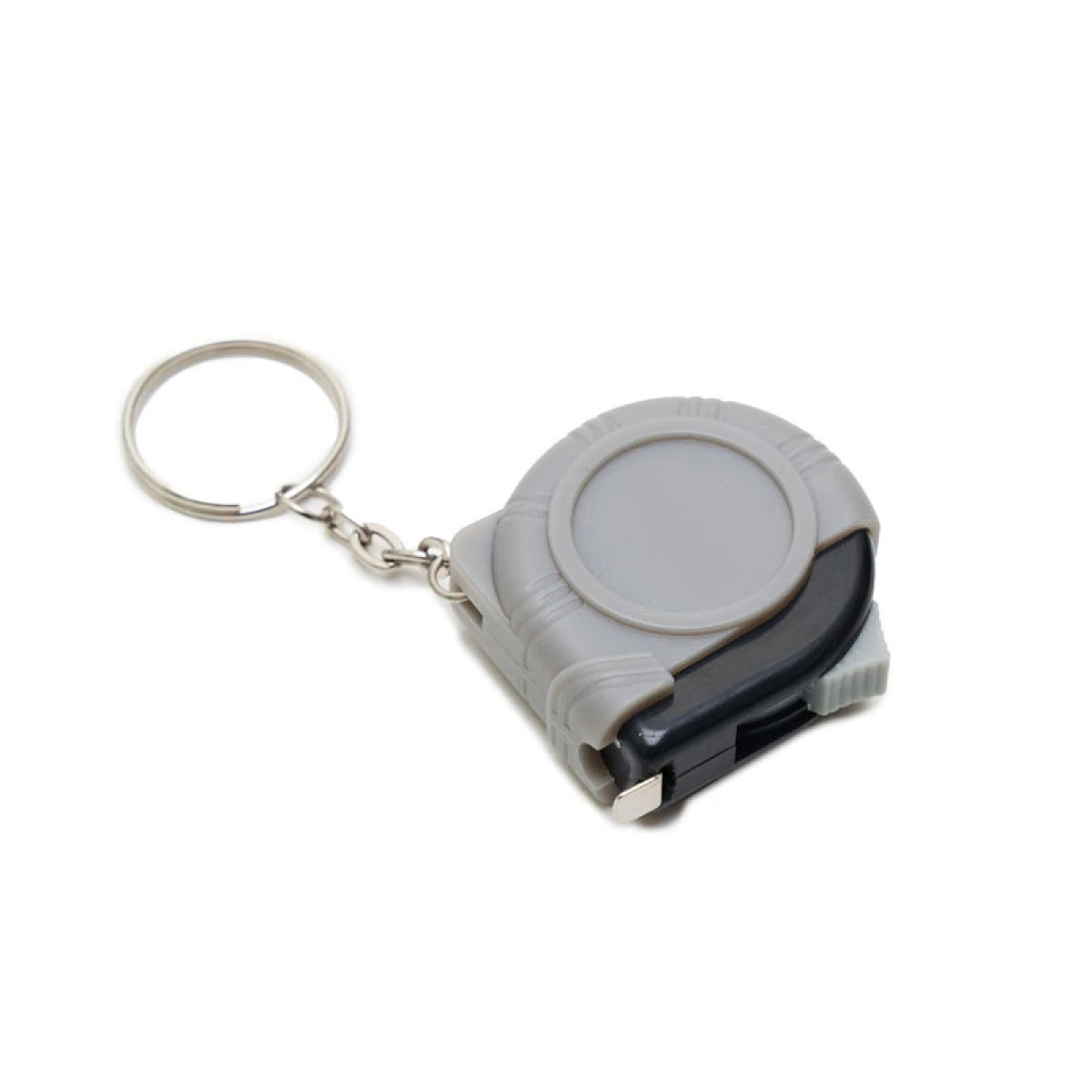 Llavero con cinta metrica retractil. Extensión: 1 metro. Medidas: 4,4 x 4,5 x 1,7 cm.