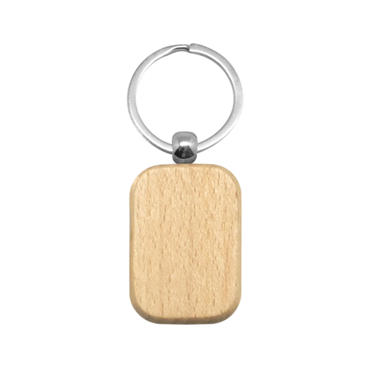 4,2 x 3 x 0,7 cm. (La medida no incluye el aro) Madera. Llavero rectangular con arandela metálica.