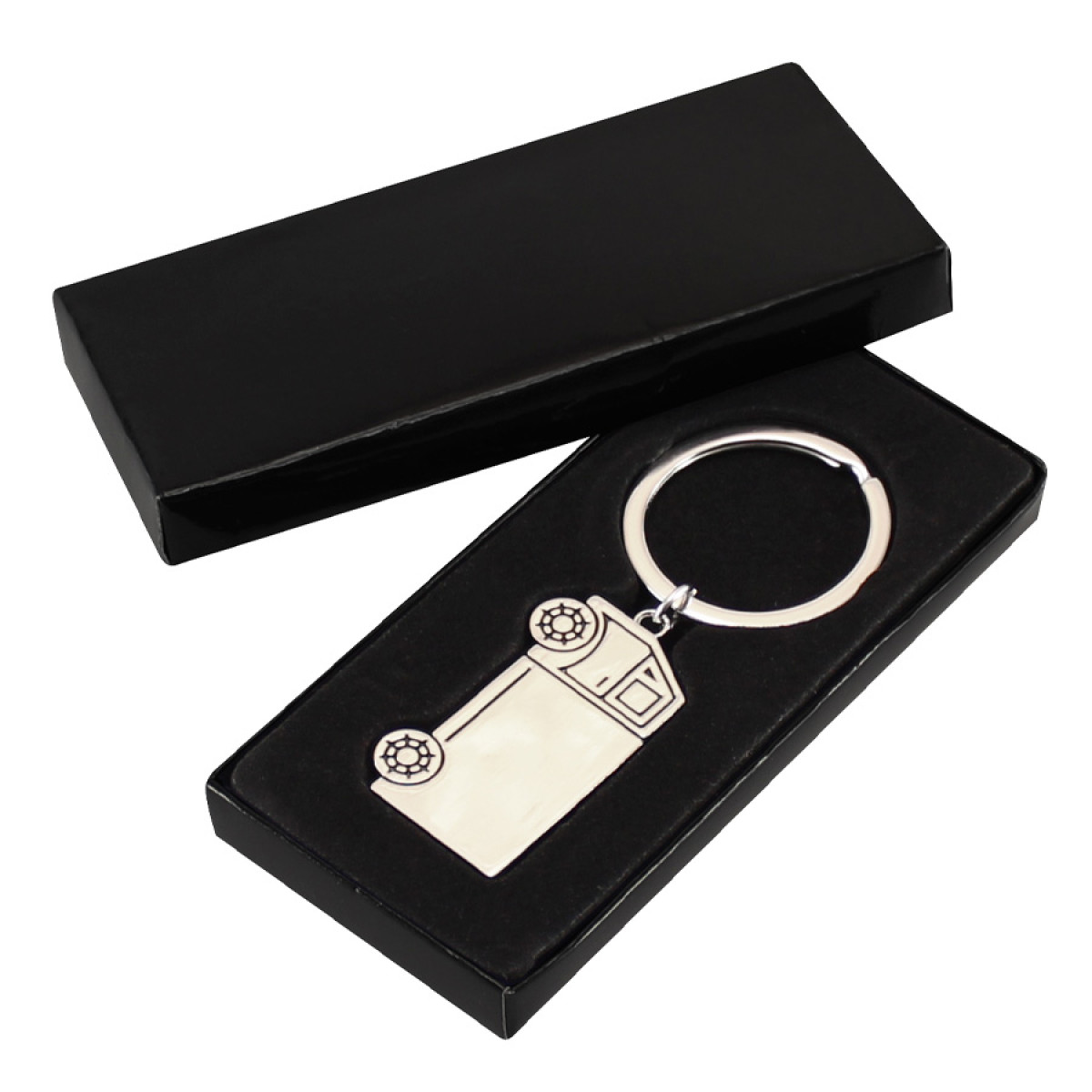 Llavero Metálico modelo "Truck", con forma de camión. Presentación en estuche laminado negro con cuna aterciopelada.