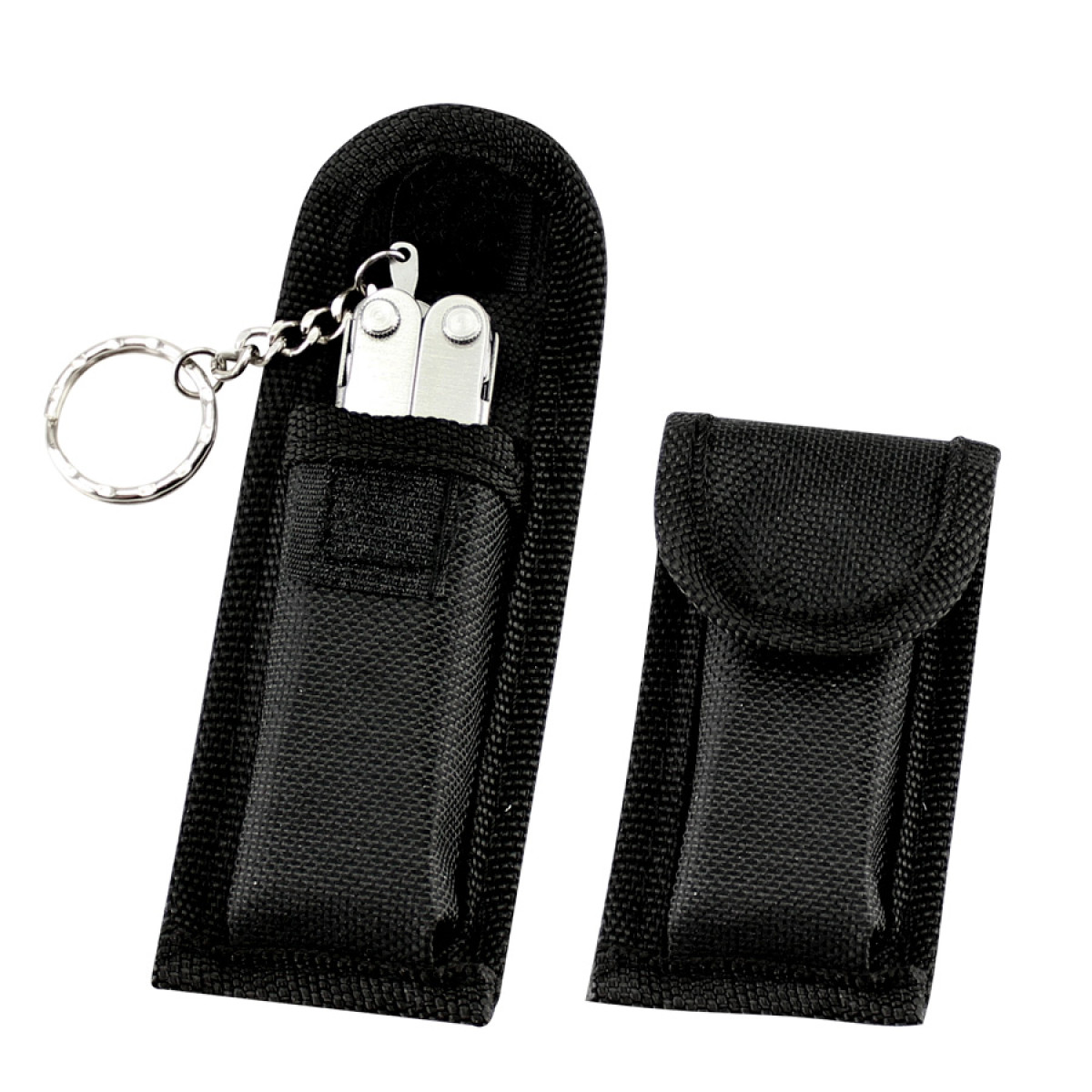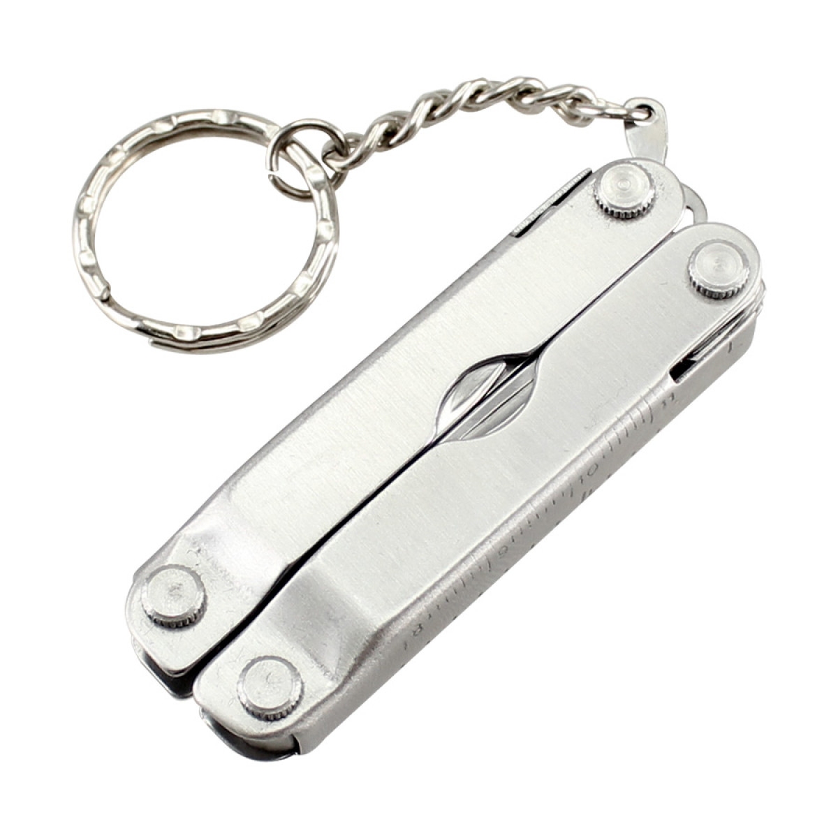 Multiherramienta metálica plegable de 10 funciones, con llavero. Incluye mini-regla en cm y pulgadas. Presentación en estuche de polyester negro y caja plateada de regalo.