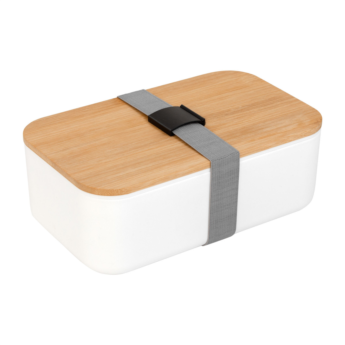 Contiene cubiertos. Perfecto para el almuerzo en la oficina.Contenedor de alimentos con tapa de Bambú. Posee un compartimento plástico y bandeja porta set de 3 cubiertos (cuchillo, tenedor y cuchara). La tapa de bambú debe presionar firmemente la bandeja donde se fija el juego de cubiertos. Cierre con sujeción elástica color gris y hebilla plástica color negro. Producto apto para microondas (sin la tapa). Importante: solo se puede calentar la comida, NO sirve para cocinarla.Medidas: 19,2 x 11,5 x 7 cm.