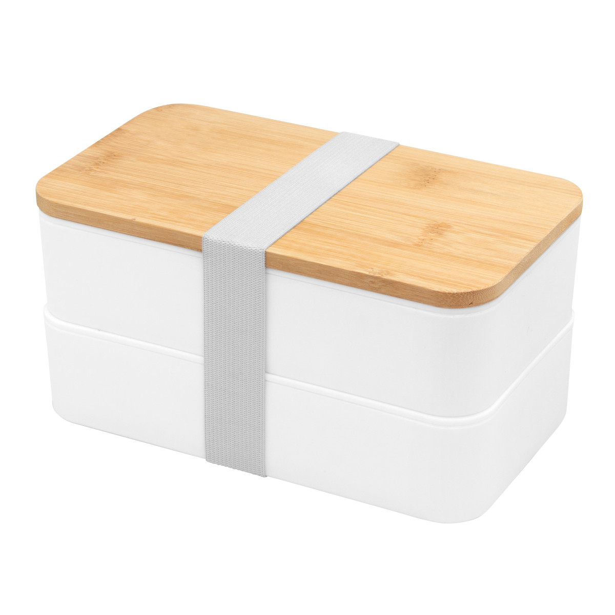 Organiza tus comidas de manera inteligente.Contenedor de alimentos con tapa de Bambú. Posee dos compartimentos plásticos, un separador y bandeja porta set de 3 cubiertos (cuchillo, tenedor, cuchara). La tapa de bambú debe presionar firmemente la bandeja donde se fija el juego de cubiertos. Cierre con sujeción elástica color gris. Producto apto para microondas (sin la tapa). Importante: solo se puede calentar la comida, NO sirve para cocinarla.Medidas: 18.5 x 10.5 x 9.7 cm.