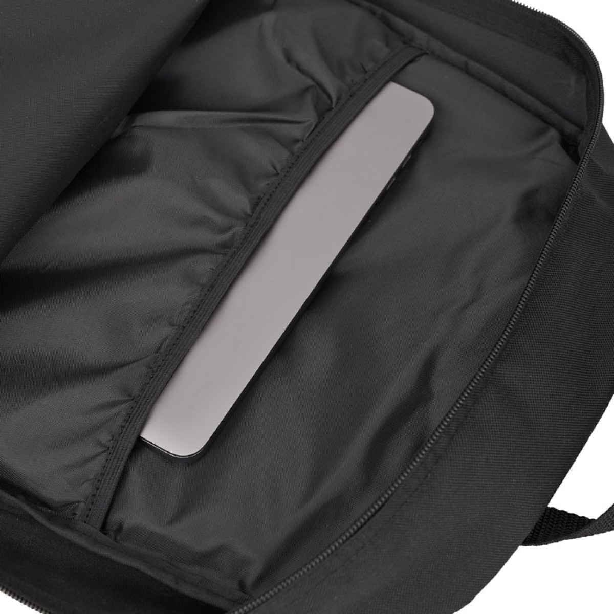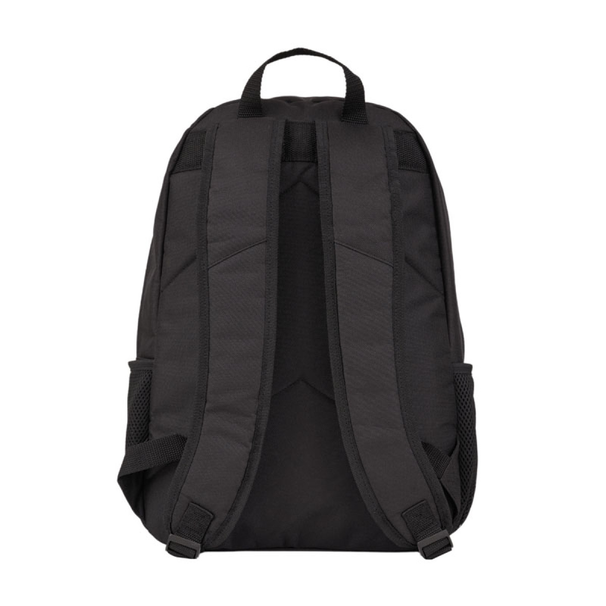 Mochila portanotebook, con respaldar acolchado, confeccionada en 100% polyester. Cuenta con dos bolsillos principales, un segundo bolsillo frontal, y laterales de red para transportar botellas o pequeños objetos.